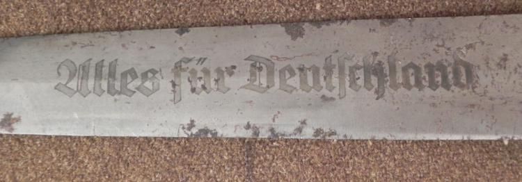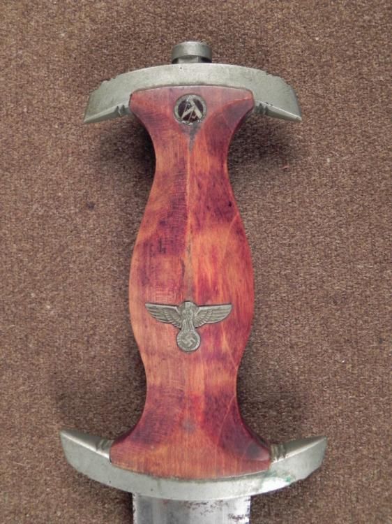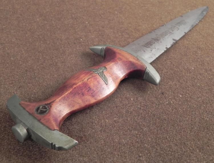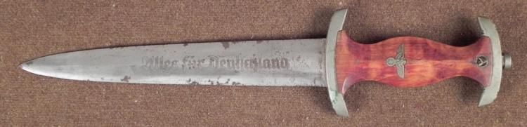 This is a WWII era Nazi German Dagger. The grip is wood, with inlaid metal eagle and swastika, and "SA" logo on small round medallion below pommel-cap. The blade is marked "Alles fur Deutschland". The blade has maker mark: Wilh. Kober & Co., Suhl. The * blade length is 8 1/2 inches, and the overall length is 13 1/2 inches. The condition is very good, with some nicks to the grip, and spotting to the blade.