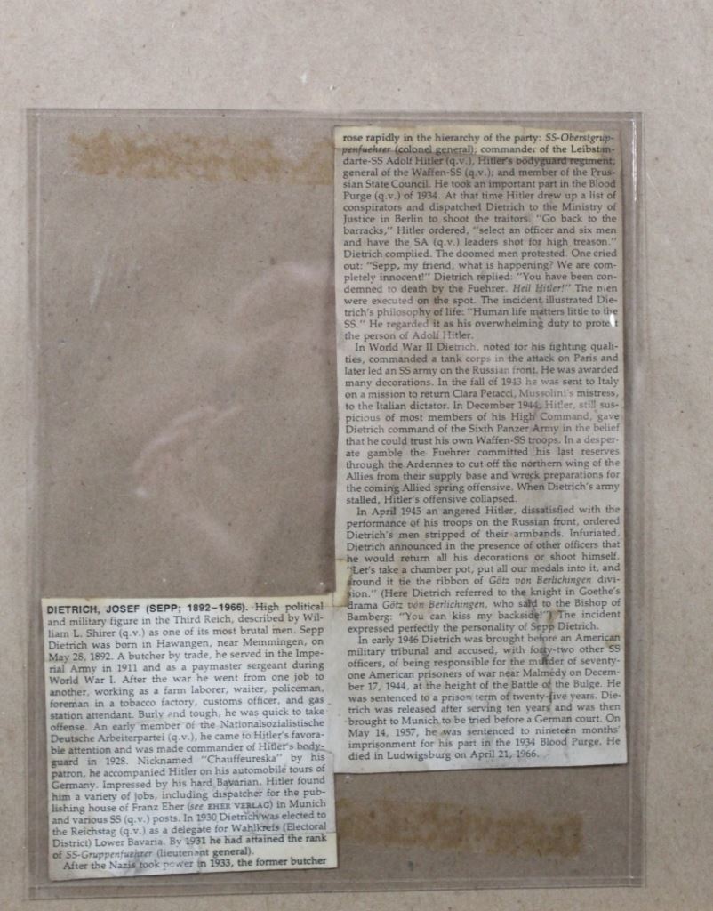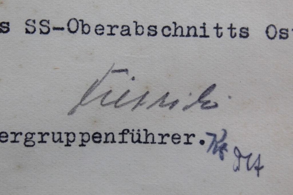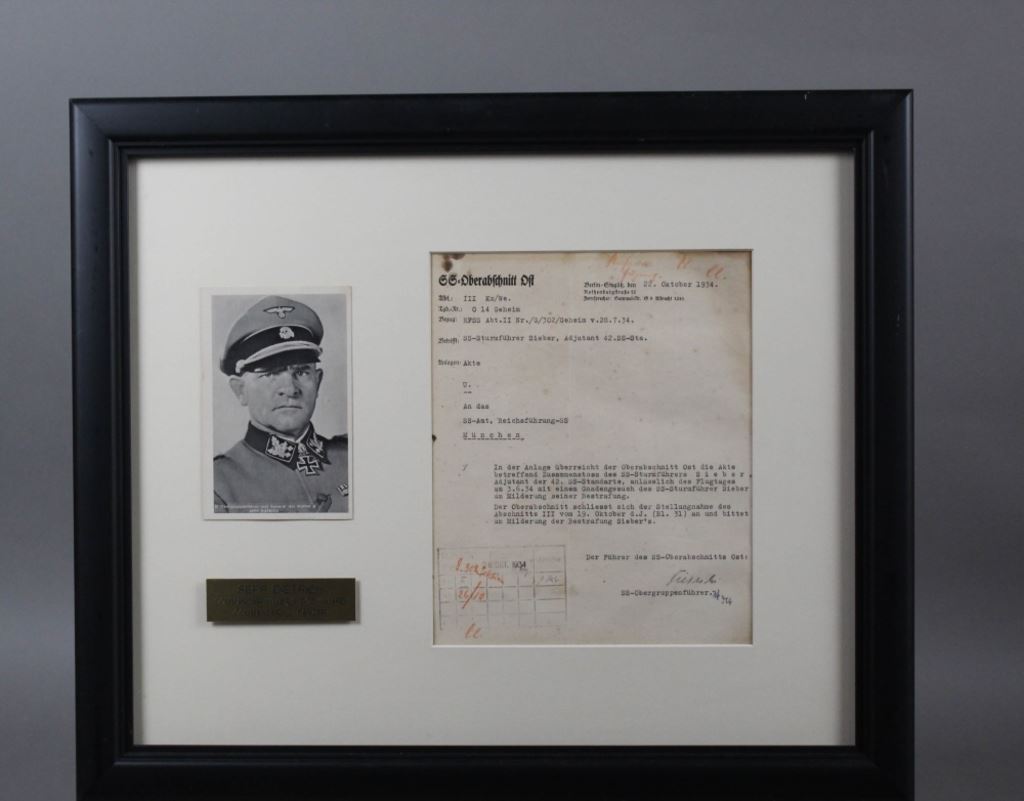 WWII Nazi SS Sepp Dietrich Signed Document. SS Oberstgruppenfuhrer Sepp Dietrich was commander of the infamous SS Leibstandarte Adolf Hitler, the premier formation of the SS. He would be one of two Waffen SS commanders to receive the Knights Cross of the Iron Cross with Oak Leaves, Swords, and Diamonds, the highest honor a German servicemen could be awarded. Signature is clear and distinct towards the bottom right of the document, some lettering is faded but legible, document has no damage. Good condition. From the Michael Clifton collection. Frame size: 16 1/2" x 19 1/2", Photo: 5 1/2" x 3 1/2", Document: 9 3/8" x 7 1/2"