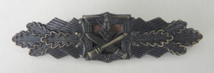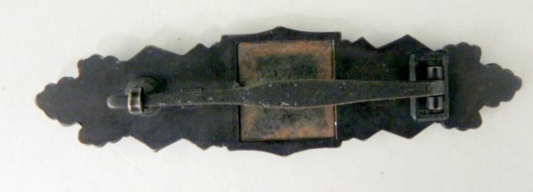 Offered here is a WWII Nazi Wehrmacht Close Combat Clasp. The back reads "JF5" and "FEC.W.E PEEKHAUS BERLIN".