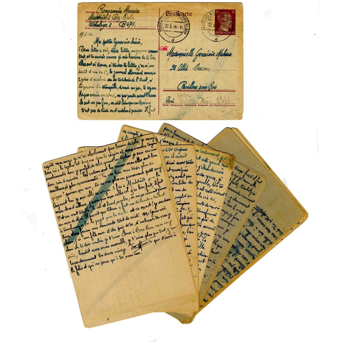 Collection of 16 WWII postcards sent from the Krupps factory in Markstadt, Poland, a work camp that exploited German prisoners for free labor. Letters dated from January-May 1944 are written in French by a Maurice Romannier, a presumed French prisoner, to Genevieve Maheux in Paris. Set reads in part: (1) 22 January 1944: ''...I went to the hairdresser, washed, put heels on my shoes, I put my suitcase in order once again...'' (2) 25 January 1944 ''...It's very late. We had a troublesome evening. There was a death in our room. Censorship does not allow me to say how he died. I must make a declaration at the office. Don't fear, I'm covered by my declaration to the police...'' (3) 26 January 1944 ''...Rationing is very bad in Paris at the moment; worse than it's ever been. I hope my little angel isn't suffering too much...Krupps gave us 10 Marks, but we pay for our work cards and our ration of marmalade each month, so Krupps gets the money back anyway...We have 20 French prisoners in our factory...'' (4) 4 February 1944 ''...It's 1 year since we entered Germany...'' (5) 28 April 1944 ''...tonight the German newspaper talks of Paris and the bombing on the 18th...I would very much like to have news...Physically there is nothing to worry about...Here one eats well. It's true I was always telling you how badly we eat, but here we eat well...We never ate this well in Germany...'' (6) 9 May 1944 ''...Typhus is always in the region...I'm vaccinated against Typhus so nothing to fear...It seems that Petain has made a declaration to transform the project into law for 18 mos...'' (7) 19 May 1944 ''...the German newspaper...[smudged] the western territories...'' Each postcard is written in very small but legible handwriting. 10 of the 16 postcards have original Hitler ''Deutsche Reich'' stamp intact. Postcards measure 6'' x 4.25'' and are in very good condition.