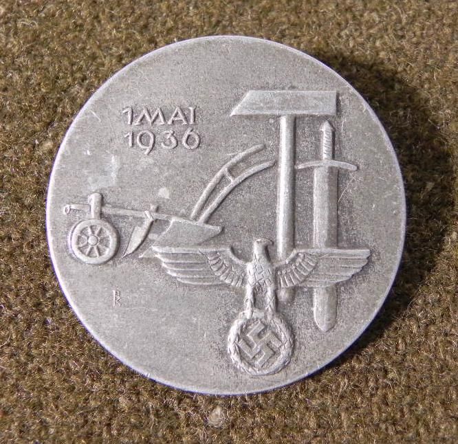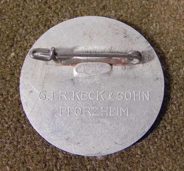 This is an original WWII era Nazi Workers Day Rally Badge. The design shows hammers with eagle and swastika. The reverse has the maker mark: G. FR. KECK & SOHN PFORZHEIM. The diameter is 1 3/8". It is in very good condition, with pin back. * This is a nice original for display.