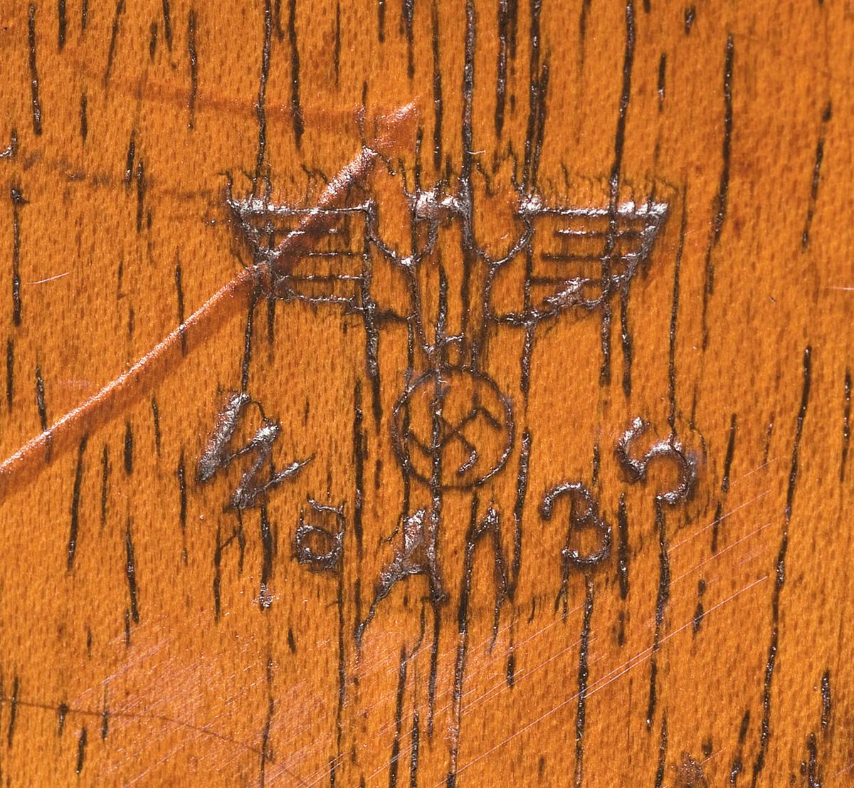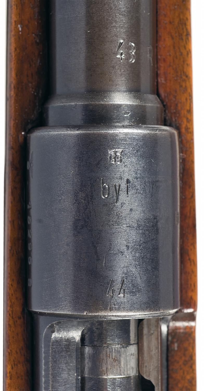 The top of the receiver is marked "eagle/135 / byf / 44", the right side "eagle/135" and the left side is marked with the Nazi firing proof and the serial number. The left receiver wall is marked "Mod. 98", the rear of the barrel is marked with a Nazi firing proof and upper right side is marked "43 R 25". All visible numbers match, except the barrel bands which are unnumbered. Milled barrel bands, stamped floor plate and trigger guard, hooded front sight, tangent rear sight graduated to 2,000 meters, slotted cleaning rod and mounted with a pistol grip stock with matching hand guard, cupped buttplate and an original cross hatch leather sling. The right rear and wrist of the stock are marked with an "eagle/WaA135" proofmark.