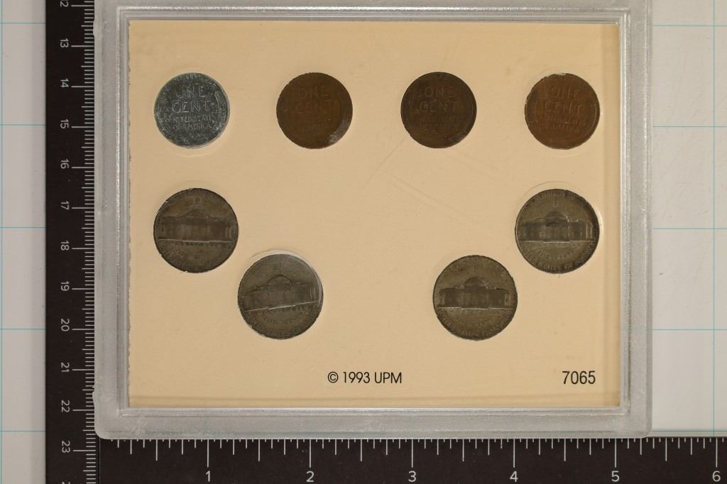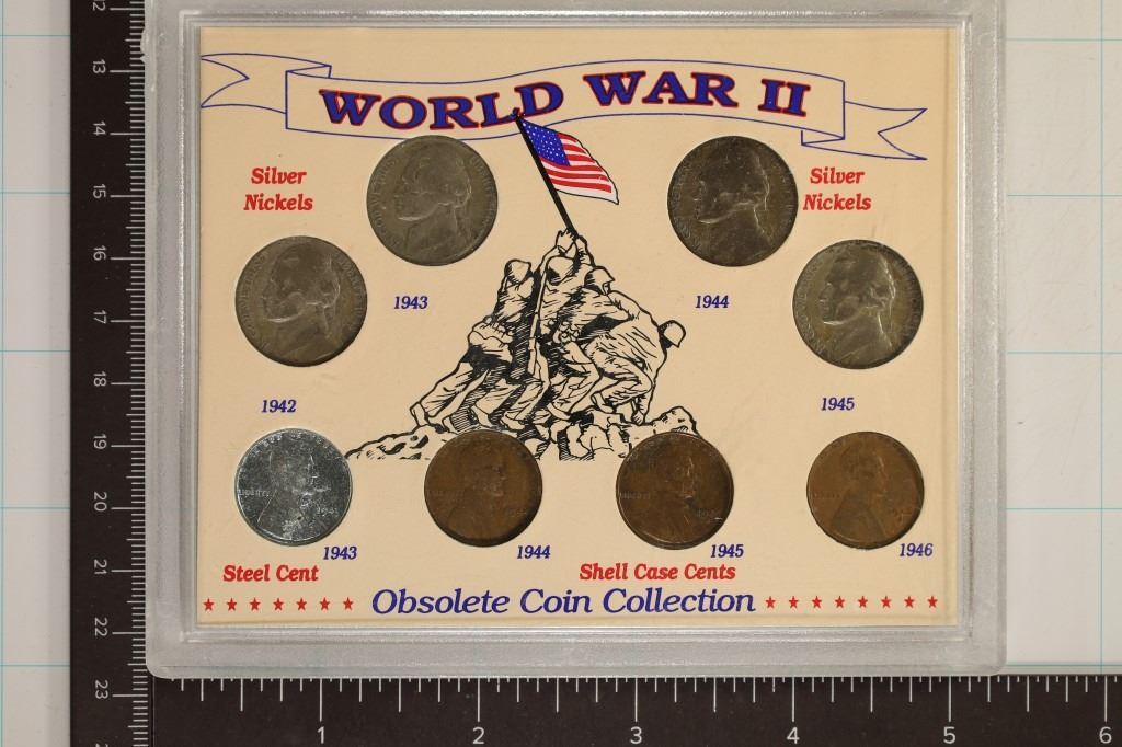 FOUR 35% SILVER JEFFERSON WAR NICKELS, 1943 STEEL CENT AND 3 SHELL CASE CENTS