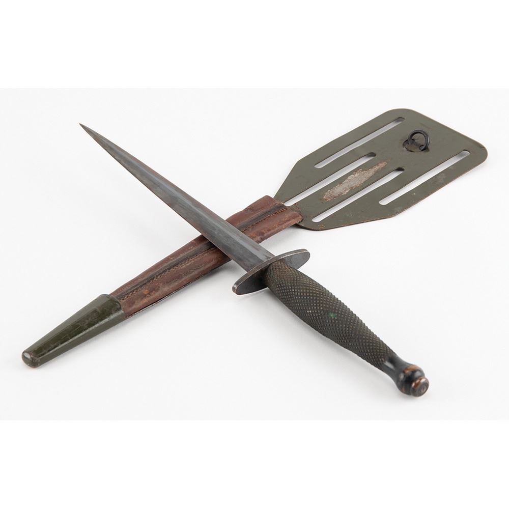 Rare official Office of Strategic Services (OSS) Stiletto Fighting Knife, known as the ‘Pancake Flipper,’ made between 1942–1943 for behind-the-front line members. The sharp steel blade measures 6.75Ë in length and the stippled brass grip measures 4.5Ë in length; this particular knife is believed to have been produced by Landers, Frary, and Clark of New Britain, Connecticut, a firm that used the British Fairbanks & Sykes (FS) Fighting Knife as their design template. Includes the original ‘pancake flipper’ scabbard; as a measure of wartime austerity, the company used the same stamping tool for their household spatula as they did to make the steel scabbard back. In overall fine condition. The knife and scabbard are accompanied by an unmarked 7-inch triangular spike dagger, a 3-inch H.G. Long & Co. blade, a 5.25 x 5 OSS flag, a WWII Special Force (SF) wing badge as worn by OSS operators, two OSS insignia badges (gold and white), and two Airborne Command badges.