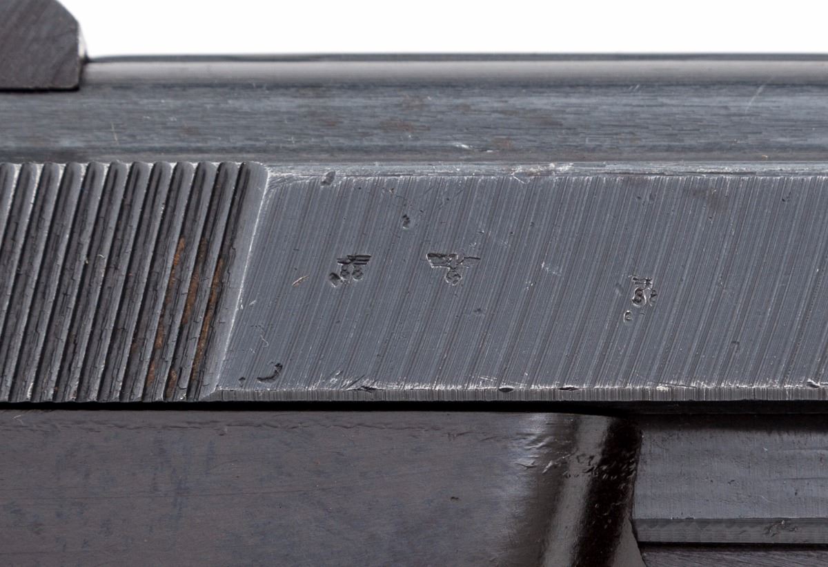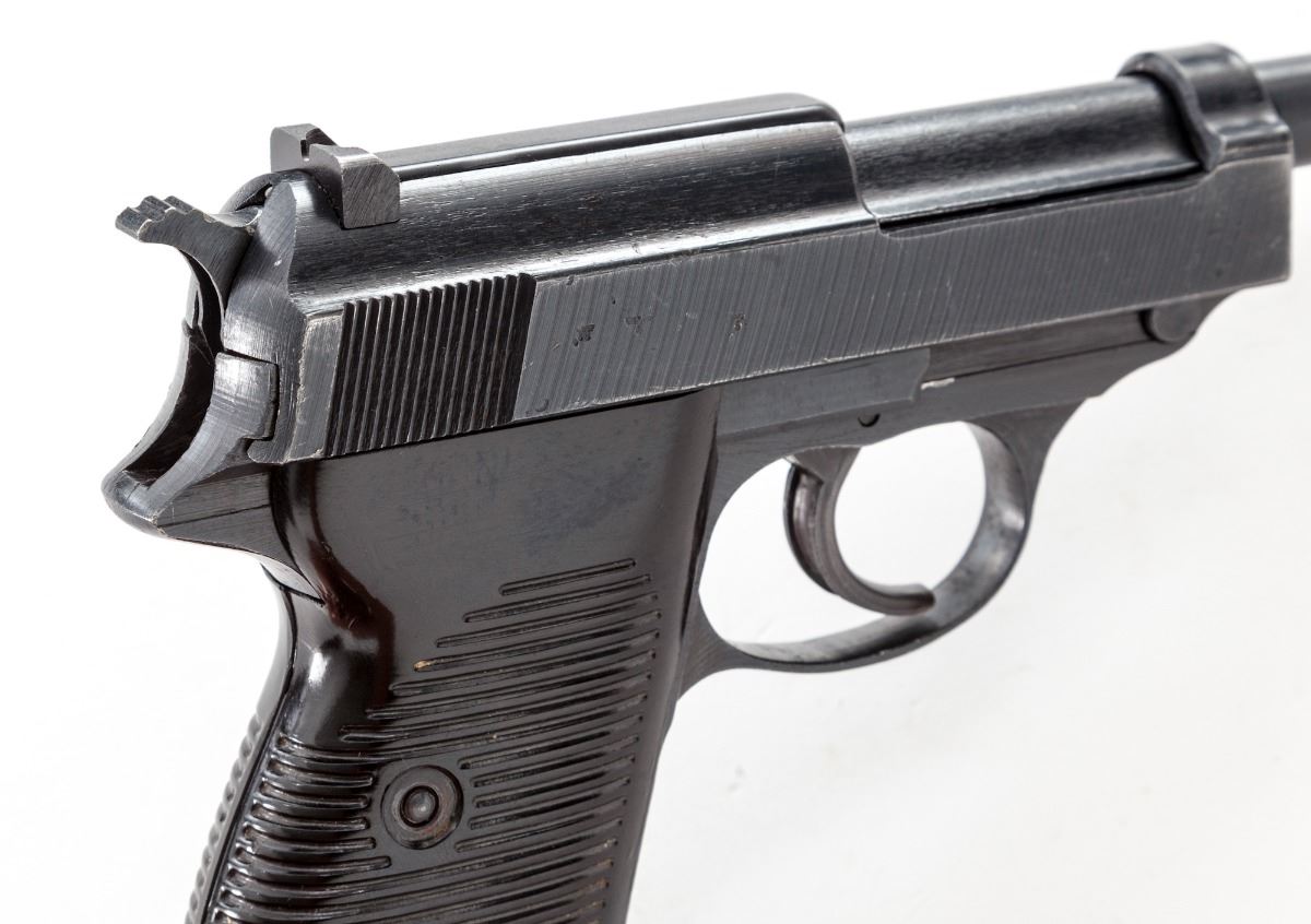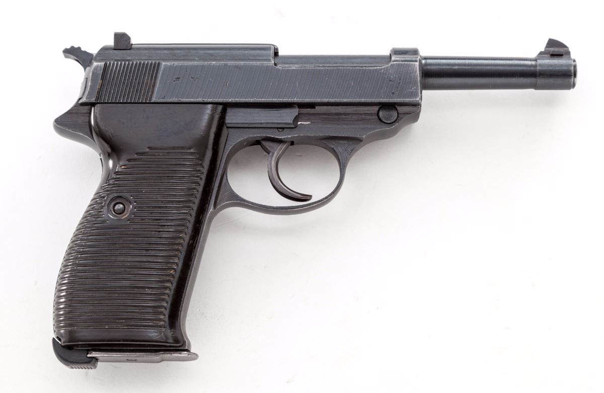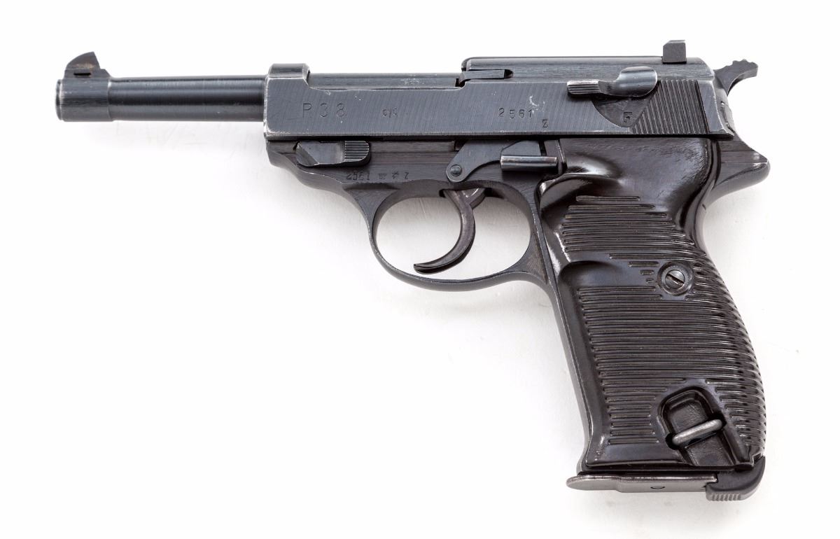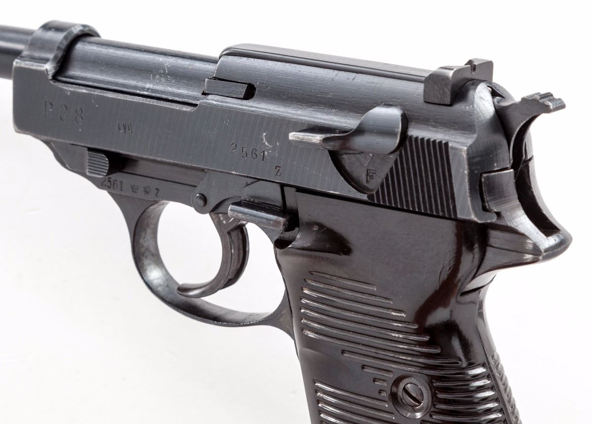 WWII P.38 Semi-Automatic Pistol, by Spreewerk (cyq), #2561Z, 9mm, 4-3/4'' barrel, matte blue finish, grooved factory grips, marked ''WaA 88'', barrel marked ''cyq Bh'', and cog-style hammer, with one WWII era magazine. Condition is fine retaining approx. 94% nicely accomplished arsenal blue for use by the post-war German army. Grips are crisp, action is good, bore is bright. Est.: $500-$750. (C&R/PPT)