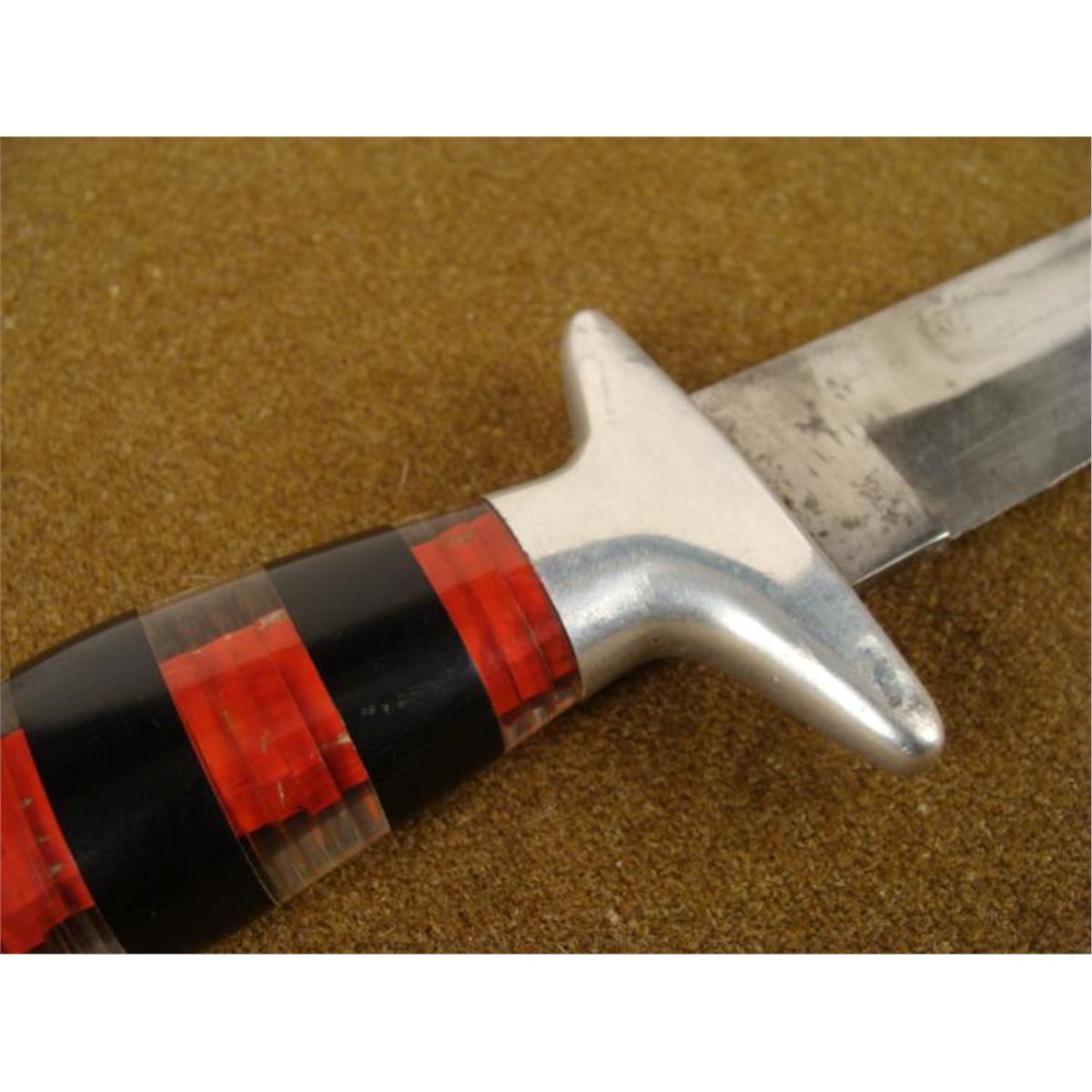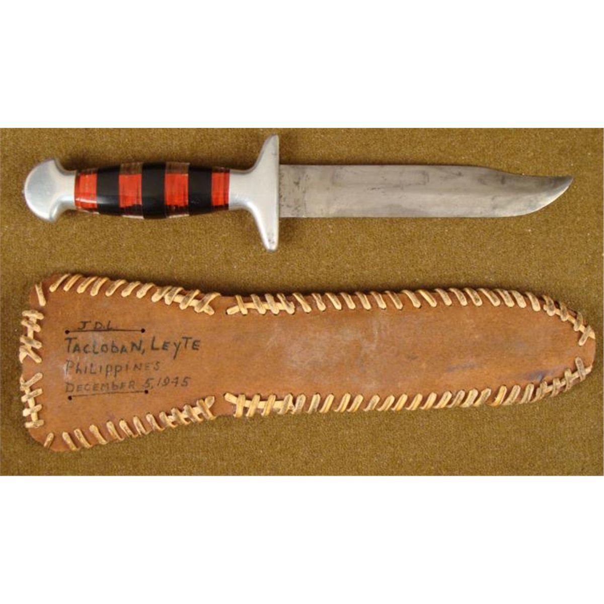 WWII PACIFIC MARINES BOWIE TYPE FIGHTING KNIFE W/LEATHER SHEATH-ID'D ON BACK * GREAT HISTORICAL FIGHTING KNIFE--LUCITE LAYERED GRIP=BOWIE KNIFE BLADE--SHEATH IS HARD SHELL LEATHER--RAWHIDE AROUND EDGING--DIAMOND AND L TOOLED INTO FRONT--REVERSE READS "JDL--TACLOBAN, LEYTE-PHILIPPINES-DECEMBER 5, 1945"GREAT COLLECTOR ORIGINAL KNIFE *