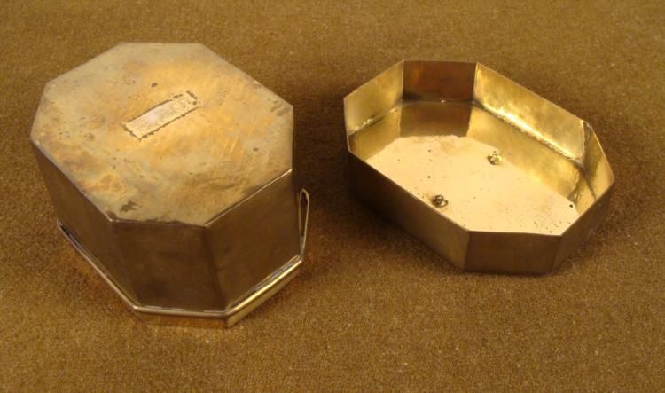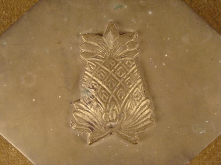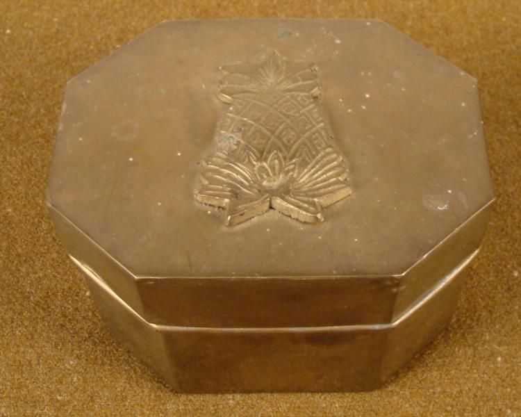 OFFERED HERE IS A WWII PACIFIC THEATER BRASS CASE WITH PINEAPPLE IN RELIEF ON TOP.; IT IS OCTAGON SHAPED WITH THE DIMENSIONS OF 4”X 5” X 3 1/2”.