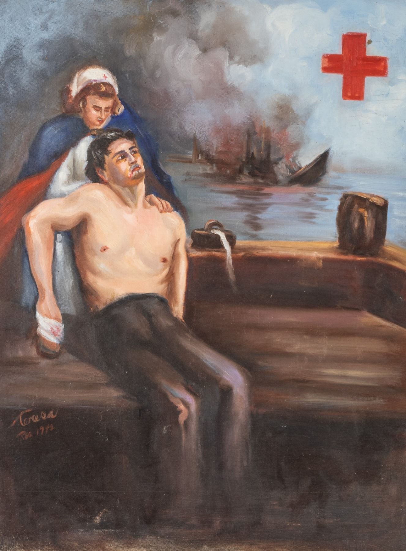 Original painting on artist board titled 'Remember Pearl Harbor' showing a young Red Cross nurse aiding an injured soldier while a Naval ship burns and scuttles in the background. The painting is attributed to Teresa C. Curcio, from New York. The painting is dated 1943. 24 x 18 inches.