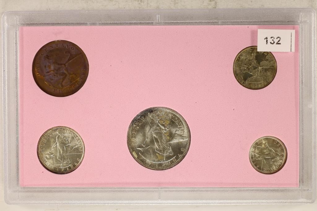 50 CENTAVOS (10 GRAMS OF .75 SILVER), SILVER 1945-D 20 CENTAVOS (4 GRAMS .75 SILVER), SILVER 1994-D 10 CENTAVOS (2 GRAMS .75 SILVER), 1944 5 CENTAVOS AND 1944-S ONE CENTAVO IN PLASTIC CASE, ALL COINS EXTRA FINE