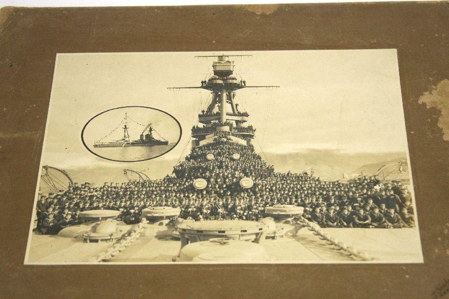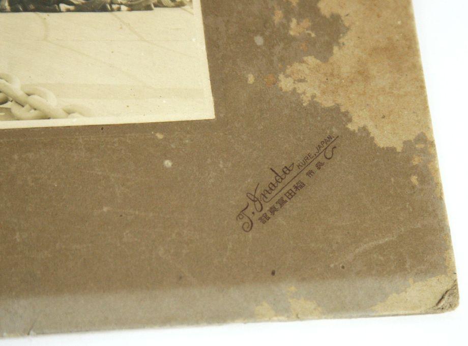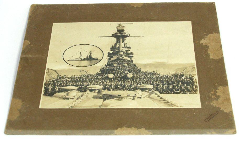 A WWII photo of a Japanese battleship, with ship's complement posing on her forecastle, forward turrets and superstructure. Picture is on brown matting. Some age deterioration to matting, but picture is in good condition.