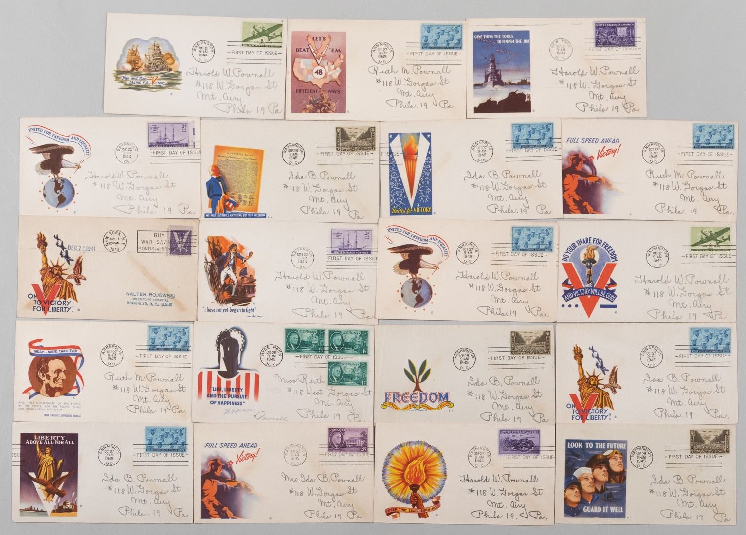 Lot of nineteen WWII envelopes with various pro-American victory illustrations. 'Full Speed Ahead to Victory!' and 'We Will Sacrifice Anything but Our Freedom' and 'Then and Now...Sailing for Victory'.