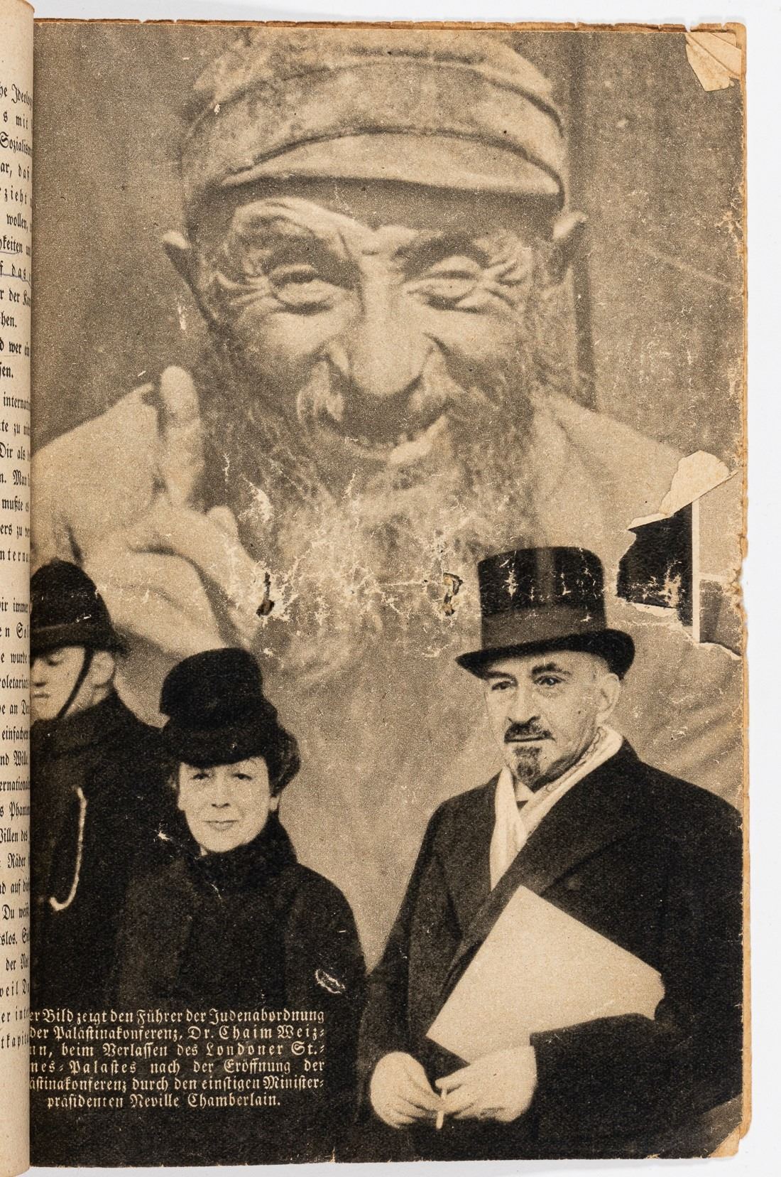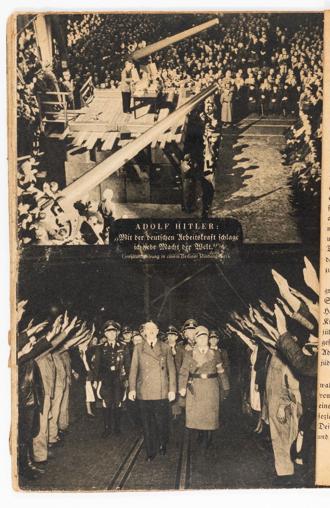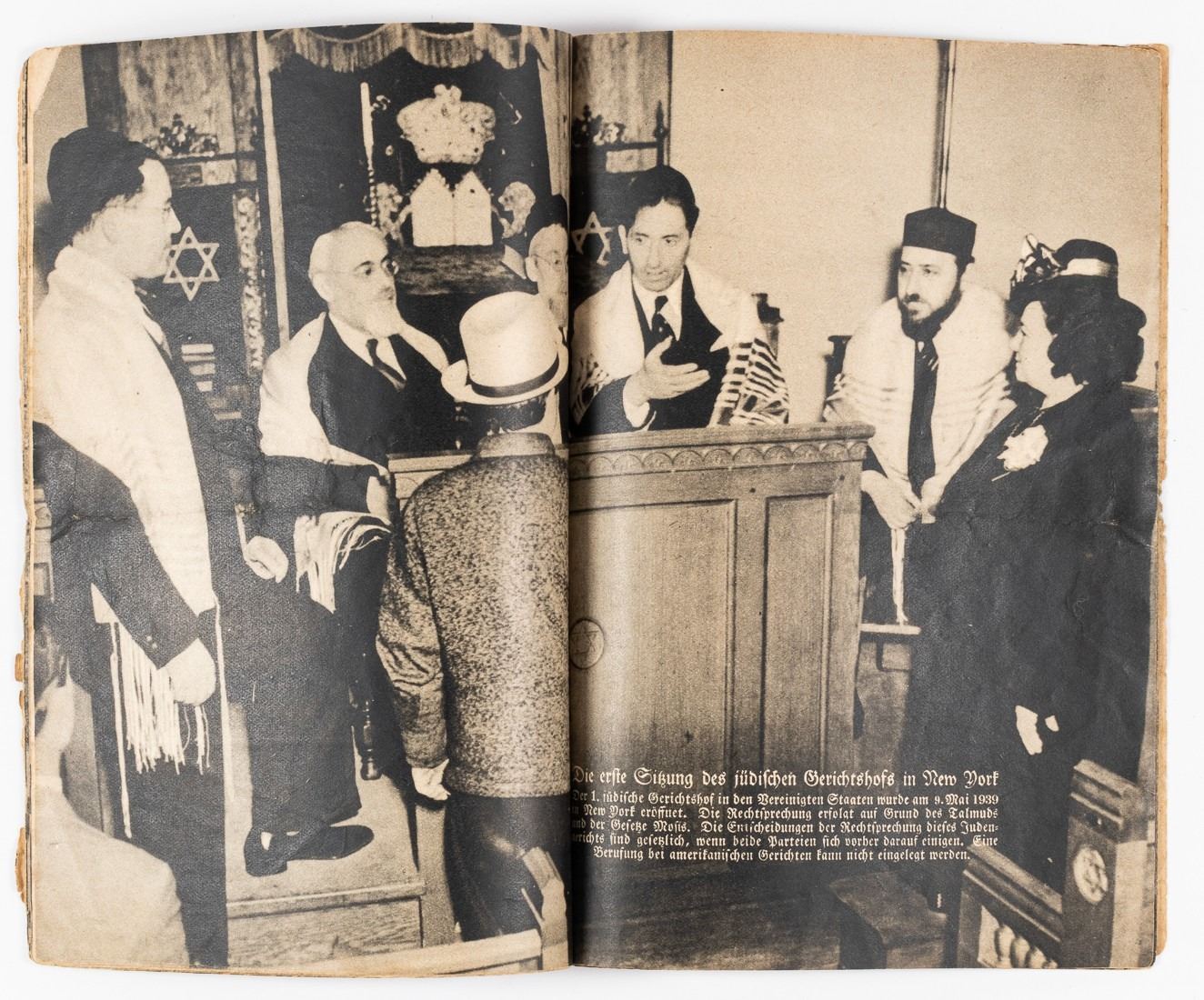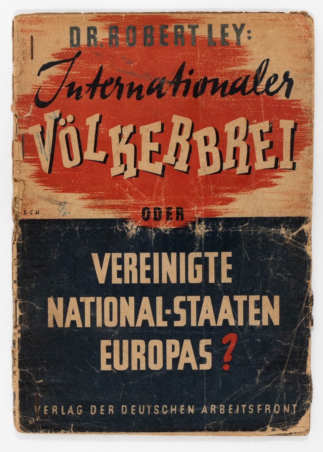 German WWII xenophobic propaganda publication 'International People Melange or United National States of Europe?' written by Dr. Robert Ley, Nazi politician and head of German Labor Front. Published by the German Labor Front in 1941, 32 pages, 8 x 5.5 inches. Many photographs, staple-bound, worn covers, notations on back cover.