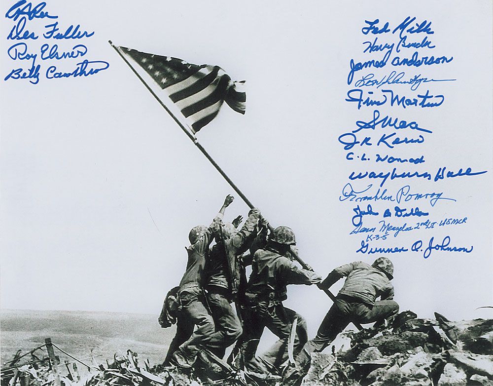 Satin-finish 14 x 11 photo of the Iwo Jima flag raising, signed in blue felt tip by James Anderson, Dick Kerin, Charles Womack, James Martin, C. A. Rea, Fred Miller, Harry Bender, John Dillon, W. J. Hall, Sterling Mace, Leo Schmittgens, Billy Joe Cowthron, Des Fullmer, Roy Elner, Frank Pomroy, Gunner O. Johnson, and Sam Menzelos. In very fine condition.