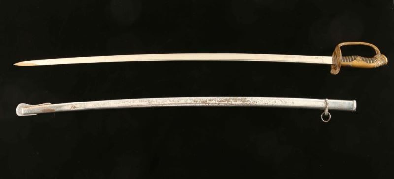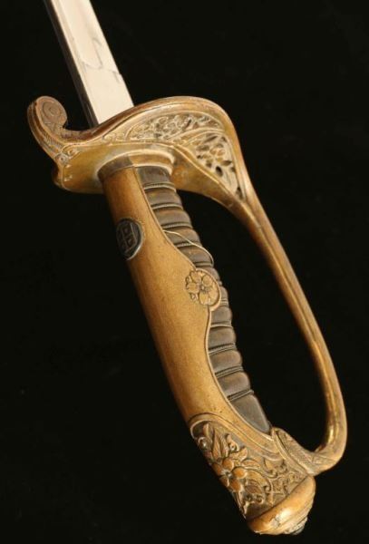 Molded floral accents on pommel, grip and guard with maker mark on front. Blade measures 31" and is in good condition. Silver metal scabbard shows some pitting and surface rust.