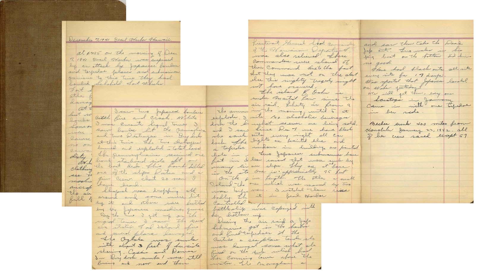 Pearl Harbor nine page battle diary written by 3rd Class Signalman Gerald H. Conrad from the USS Pennsylvania, approximately two weeks after the 7 December 1941 attack. This personal account, handwritten in cursive, reads in part, ''…At 7:55 on the morning of Dec. 7, 1941, Pearl Harbor was surprised by an attack by Japanese bomber and torpedo planes and submarines. Previous to this time they had bombed Schofield, Fort Wheeler, Fort Shafter, Honolulu, and other fields. Doing considerable damage to Hickam Field. At this time I was in bed but was awoken by exploding bombs and roaring plane motors. Someone mentioned that we were being attacked. This of course I didn't believe as no one expected such a cowardly attack by the dirty Japs. Hurriedly I put on my clothing and ran outside to see the air full of 50 cal. Machine gun shells and anti-aircraft shells exploding in the air. The sky was literally full of exploding shells and diving Japanese planes. The planes they flew were carrying the Japanese insignia of the Rising Sun. Soon the planes had left but were back again in no time. Overhead I saw a formation of seven planes (Jap) as I watched them I saw them release as many bombs. These bombs were dropped from a very high altitude directed at our battleships which were moored to the quarries in Pearl Harbor. Soon another formation was sited high overhead. They too dropped bombs on the battleships. At this time, 3 of the 7 battleships were in flames: Oklahoma laying on her side, Arizona filling the sky with black smoke, and the West Virginia on fire, too. These ships were damaged heavily and sunk to the bottom with the super structure showing…The ships that were sunk are as follows: Utah -- total loss, California, West Virginia, Arizona -- total loss, Oklahoma, Nevada, Oglala -- total loss, Cassina -- total loss, Downes -- total loss, Shaw -- total loss…Every effort is being made to raise the sunken ships except the ones marked total loss. The Arizona burned for 36 hours before they could get her out. Thousands of lives were lost, how many hasn't as yet been disclosed for sure. Last report I heard was 2,800. I have every reason to believe there is many more…As soon as the Secretary of the Navy heard of the tragedy here, he came to inspect the damage. Ten days later Admiral Kimmel was relieved of the CINC [Commander-in-Chief] and reduced to the rank of Rear Admiral. Admiral Rye Commander of Battleships is CINC now until Admiral Nimitz arrives here to take command of the U.S. Fleet as CINCUS…These Commanders were relieved of their command due to the fact that they were not on the alert else this mighty tragedy might not have occurred. The Island of Oahu is under Marshall Law since the air-raid. Liberty is from 9 in the morning until 5 at night. No alcoholic beverages whatsoever are being sold. Since Dec. 7 we have blackouts every night. All car lights are painted blue and windows in buildings are painted…Two Japanese submarines have been raised that were sunk by our ships. They are at the Sub Base. One is approximately 75 feet in length. The other a small one which was manned by two men. I watched them raise it in Pearl Harbor and saw them take the dead Jap out. Two weeks in his pig boat on the bottom did him no good…Have had blackouts all nite, every nite for 17 days. Was reported that Japanese landed on Wake yesterday. We will get them, every one…'' Diary, measuring 5.25'' x 8'', was manufactured by the U.S. Government printing office and is in very good condition. Includes typed transcription of the diary account, as well as four family photos and several ''copy'' photos of the Signal Tower at Pearl Harbor where Gerald was stationed during the actual attack, a couple ''copy'' documents (Census records and military transfers) and miscellaneous research material. An excellent, detailed first-hand account.