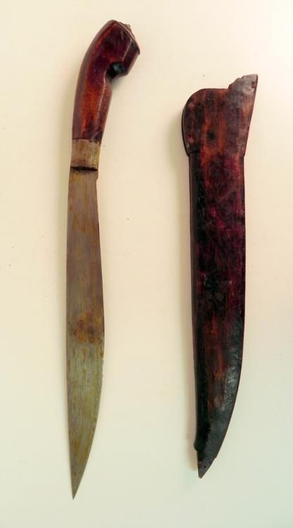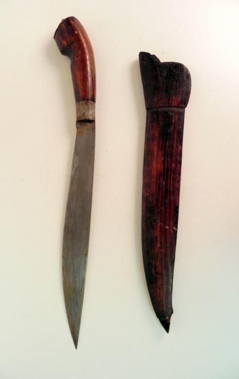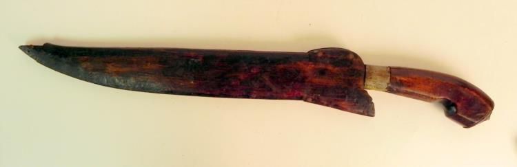 Offered here is this WWII Philippine Borang Bolo Knife. It is in total 21" long and the blade itself is 12.75". The scabbard is starting to split in two.