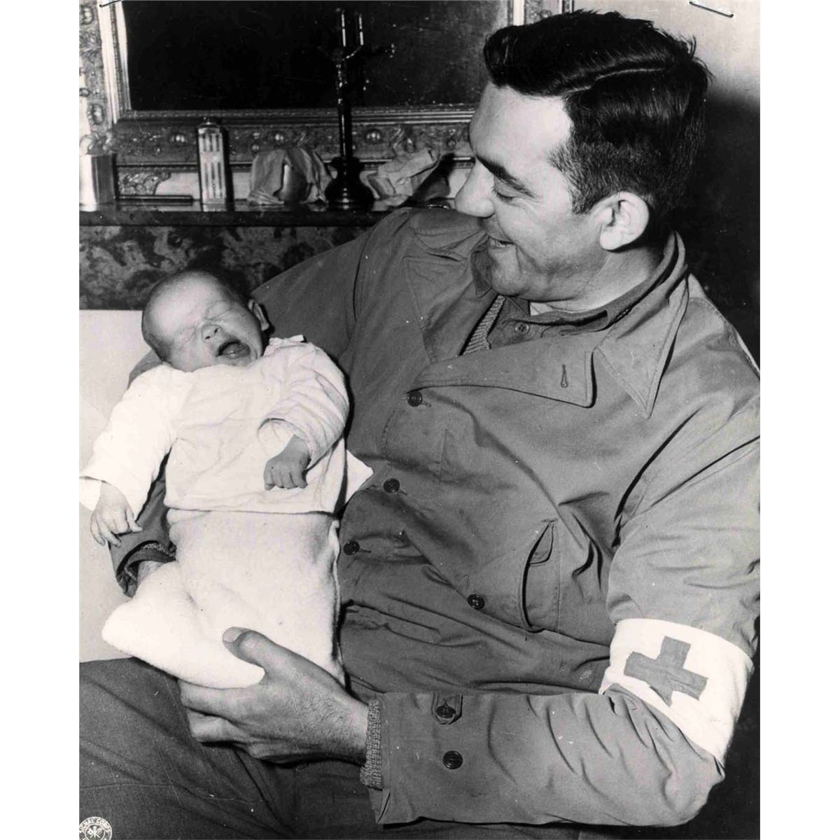 Original World War II press photo dated 14 July 1944 of American Major Nicholas E. Keserie cradling a French baby. Information sheet stapled to the photo from the Army Photographic Agency indicates that the baby was one of the first delivered by U.S. Army medics in the Utah Beach Sector, France. Glossy black and white photo measuring 8'' x 10'' has two staples, else fine.