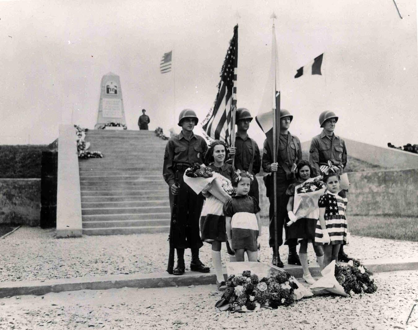 Original World War II press photo of the U.S. Color Guard and French flower girls standing in front of a D-Day monument at Utah Beach, France, dedicated to the fallen men of the 1st Engineer Special Brigade. Army Photographic Agency information sheet stapled to photo dates it to 6 June 1945. Glossy 10'' x 8'' black and white photo has two staples, otherwise near fine.