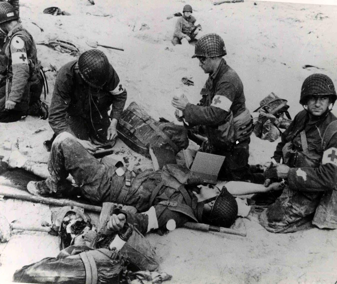 Original World War II press photo of medical personnel attending to injured troops during the first landings at Utah Beach in northern France. According to information sheet stapled to photo and stamped by the Army Photographic Agency, dates to 6 June 1944. The 10'' x 8'' black and white photo contains some moderate scratch marks in the middle and is stapled twice at the top and bottom right corners, else very good.