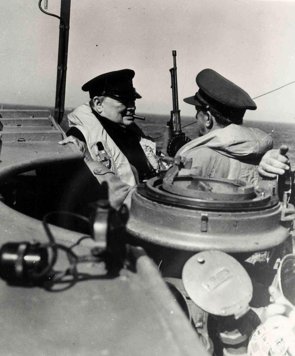 Undated World War II Naval photo of two soldiers conversing on ship. Glossy black and white photo measuring 8'' x 10'' has minor scratching and spotting presumably from damaged negative. Also has staining on top of verso, otherwise in very good condition.