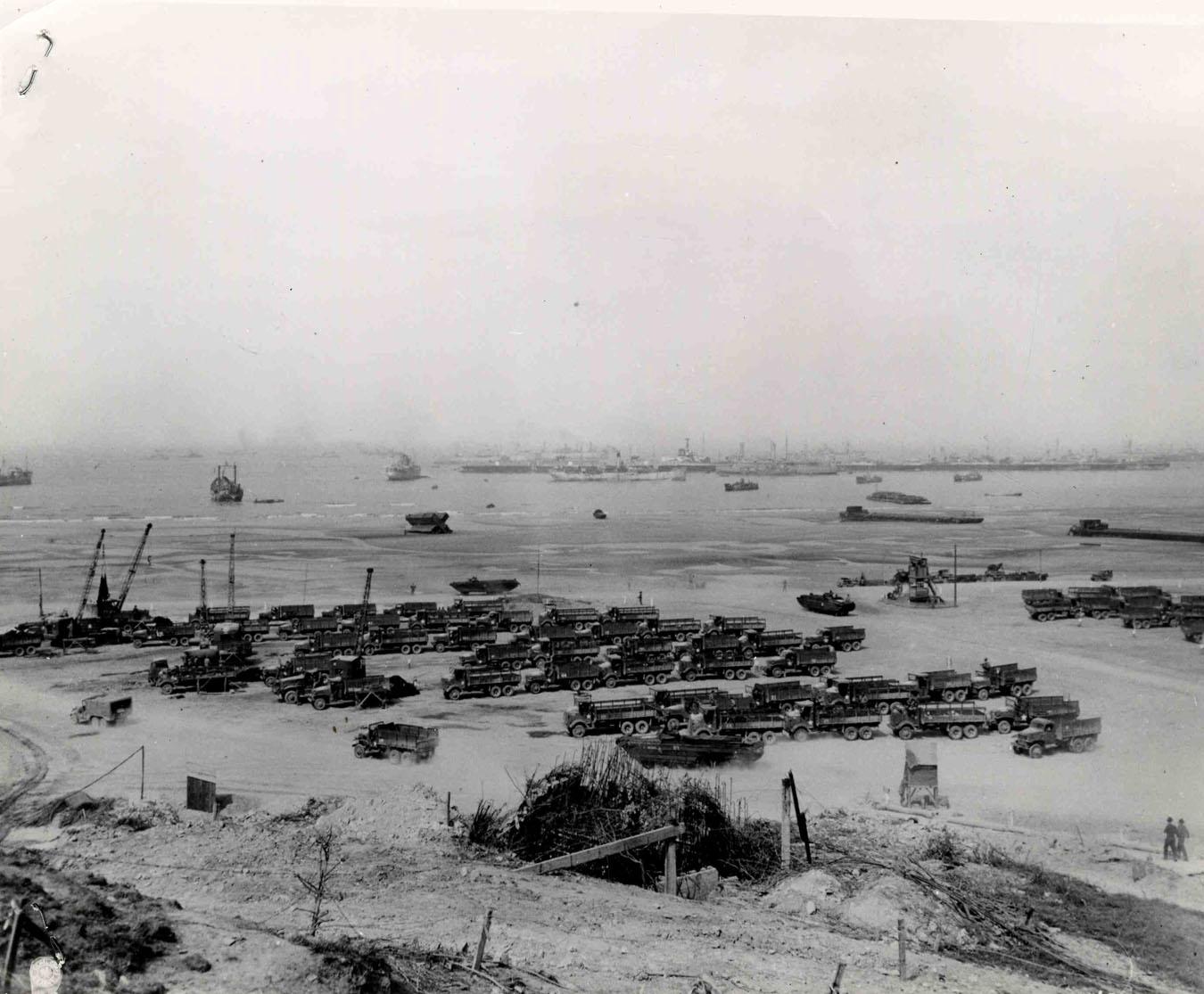 Original World War II press photo of cargo trucks on Normandy Beachhead. Army Photographic Agency information sheet dates photo to 7 July 1944 states that the cargo is distributed to various supply and ammunition dumps in France. Sheet also stamped, ''Released for Publication by Overseas Field Press Censor. Glossy 10'' x 8'' black and white photo has two staples and has a 1'' crease near left corner, else very good.