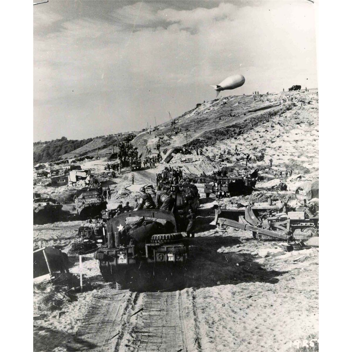 Original World War press photo of Omaha Beach three days after D-Day, busy with soldiers, trucks, bulldozers, jeeps and what appears to be a blimp. Army Photographic Agency information sheet stapled to photo dates it to 9 June 1944 and states, ''…Telephone poles and lines, strung by Signal Corps men, establish communications between the forward moving troops and the beachhead…'' Glossy black and white photo measuring 8'' x 10'' has two staples, else near fine.