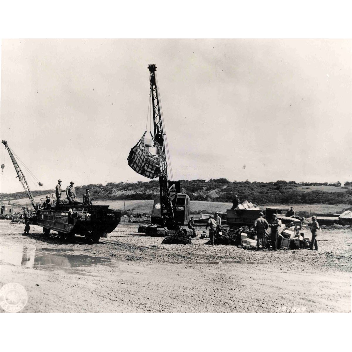 Original World War II wire photo of a crane unloading cases of food at Omaha Beach, France. The U.S. Army Photographic Agency's information sheet glued to the verso dates photo to 1 July 1944 and states that the food will be delivered to soldiers on the front line and to French civilians. Black and white glossy photo measuring 10'' x 8'' has light corner creasing, else near fine. U.S. Army Signal Corps stamp to lower left corner.