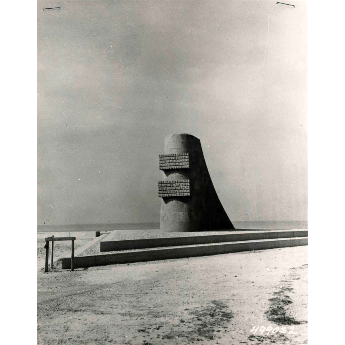 Original World War II press photo of a simple stone memorial dedicated by French Government in Omaha Beach, France. Information sheet stapled to photo from the Army Photographic Agency states that the inscription in both French and English, reads: ''The Allied Force landing on this shore which they call 'Omaha Beach' liberate Europe / June 6, 1944.'' Black and white photo measuring 8'' x 10'' has spot marks and scratches throughout, perhaps from negative transfer, else very good.