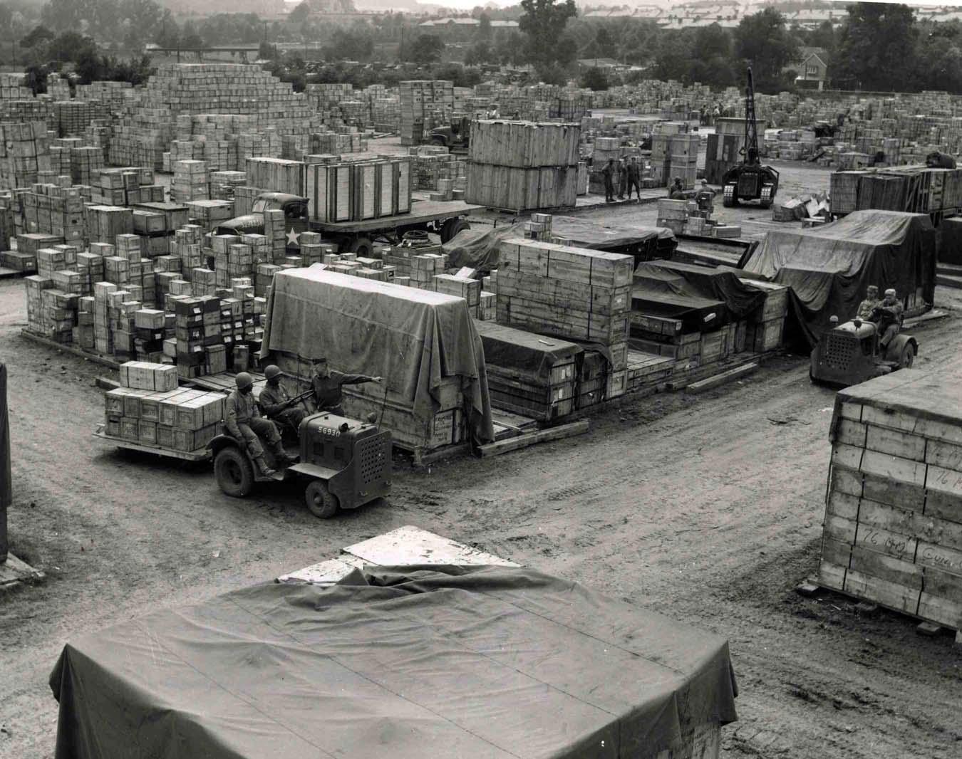 Original World War II wire photo shows a quarter of million ordinance items in what was a ballpark in Tidworth, England. According to the Department of the Army's typed information on the verso dated 28 July 1944, the supplies and parts will be used for replacements and repairs in Normandy, France. The glossy 8'' x 10'' black and white photo has slight creasing and scratching, else near fine.