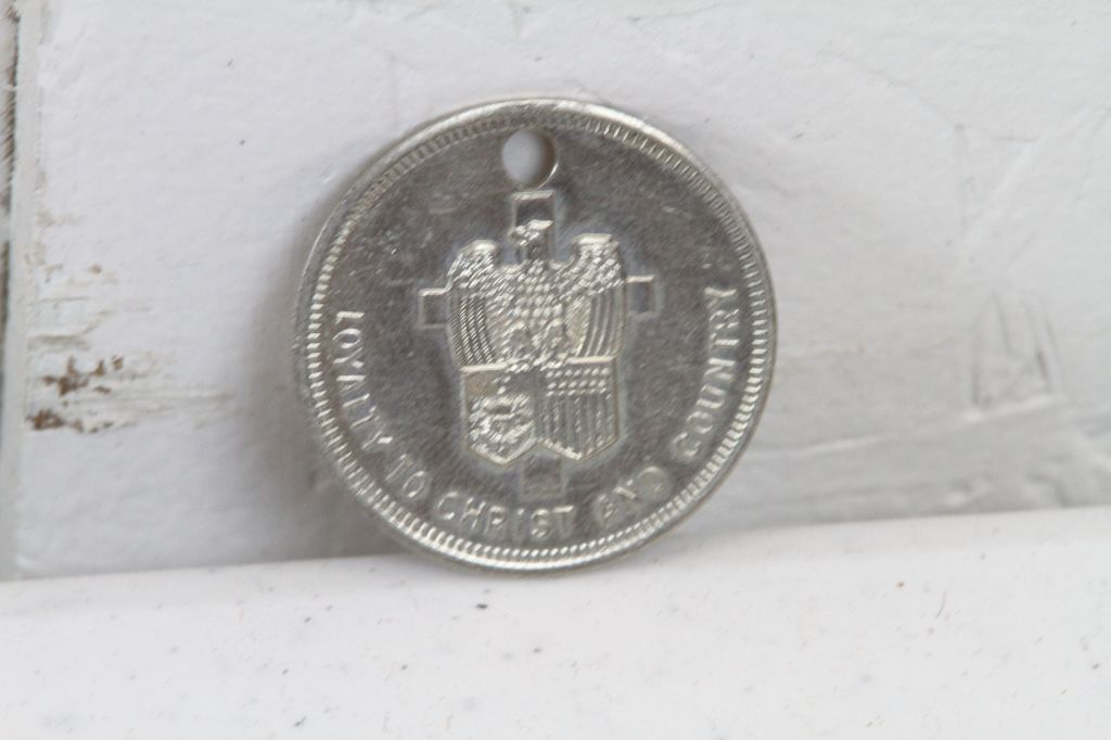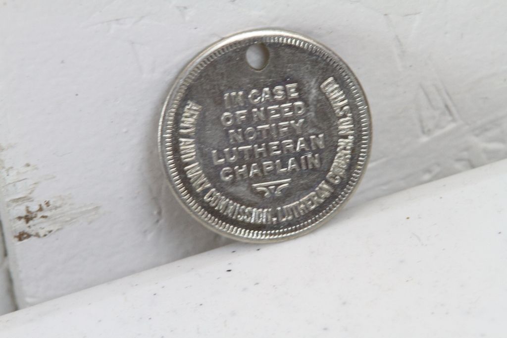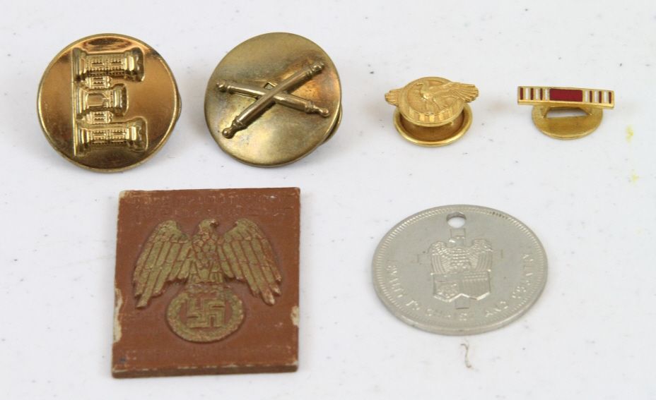 WWII Pins and Tokens Included are 6 items from Nazi piece reading, "NSDAP 1938" and alot of German, a Army and Navy Commission, Lutheran Church Token, U.S. Artilery Pin, and three various Pins. (one money)