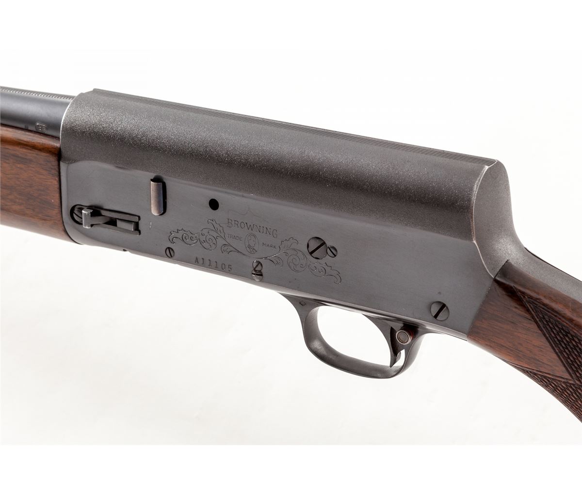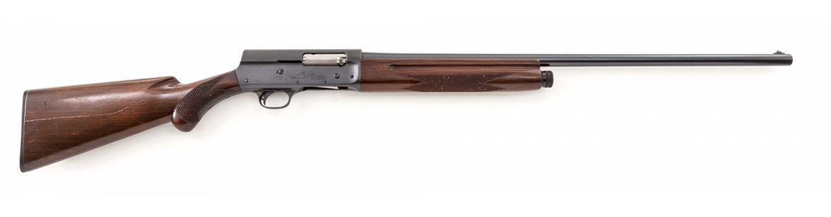 WWII Production Browning Auto-5 Semi-Automatic Shotgun, #A11105, 16 ga., 28'' round barrel, blue finish, factory checkered walnut stock with round knob pistol grip, and original Browning black plastic buttplate. From 1940-1946 production of the Auto-5 was turned over to Remington - A serial number prefix for 16 ga., B for 12 ga., C for 20 ga. These Remington-made versions differ from their Belgian counterparts by use of a heavily matted receiver top and upper tang. Condition is near excellent retaining approx. 97%+ original Remington type blue. American walnut stock with light impressions to both sides and one somewhat significant, although shallow, scratch to right side of buttstock. Action remains crisp, bore is bright. Est.: $500-$750. (C&R)