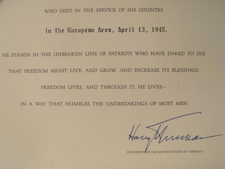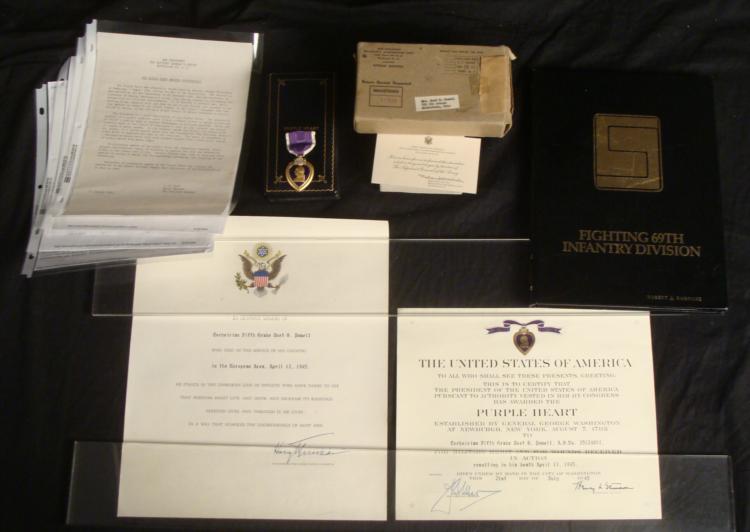 Here is a personal collection of memorabilia, all from a single soldier who died in service during WW II. All items have been well preserved, and are in excellent condition. * They include the following: * Purple Heart award in original hinged presentation case with card, in original box, plus mailing box Purple Heart certificate, with soldier's name, and date of death, 10" x 12" Truman dedication certificate, with soldier's name, and date of death,12" x 14 1/2" Historical book of the Fighting 69th Infantry Division; the soldiers regiment, the 269th Engineer Battalion is highlighted War Department letter regarding the awarding of the Purple Heart, dated January 1945 Several pages of information on the 269th Engineer Battalion * This is a special collection in honor of a WW II soldier. This is an impressive collection from an honorable veteran. *