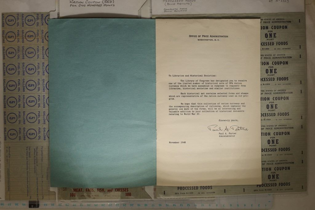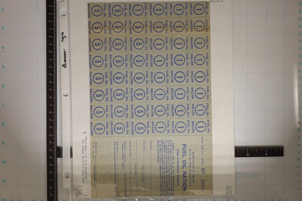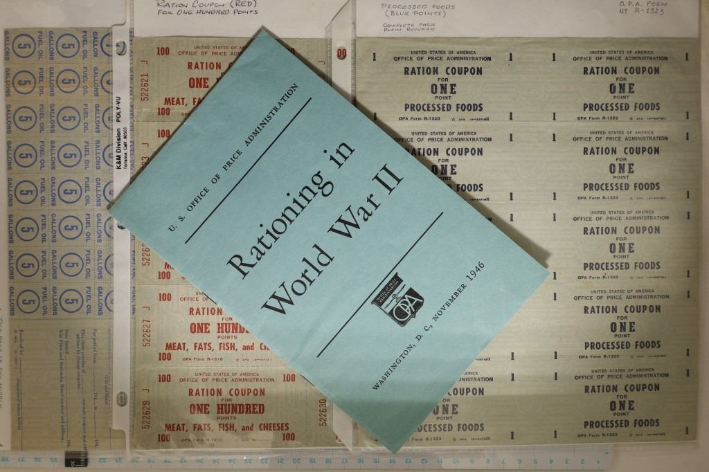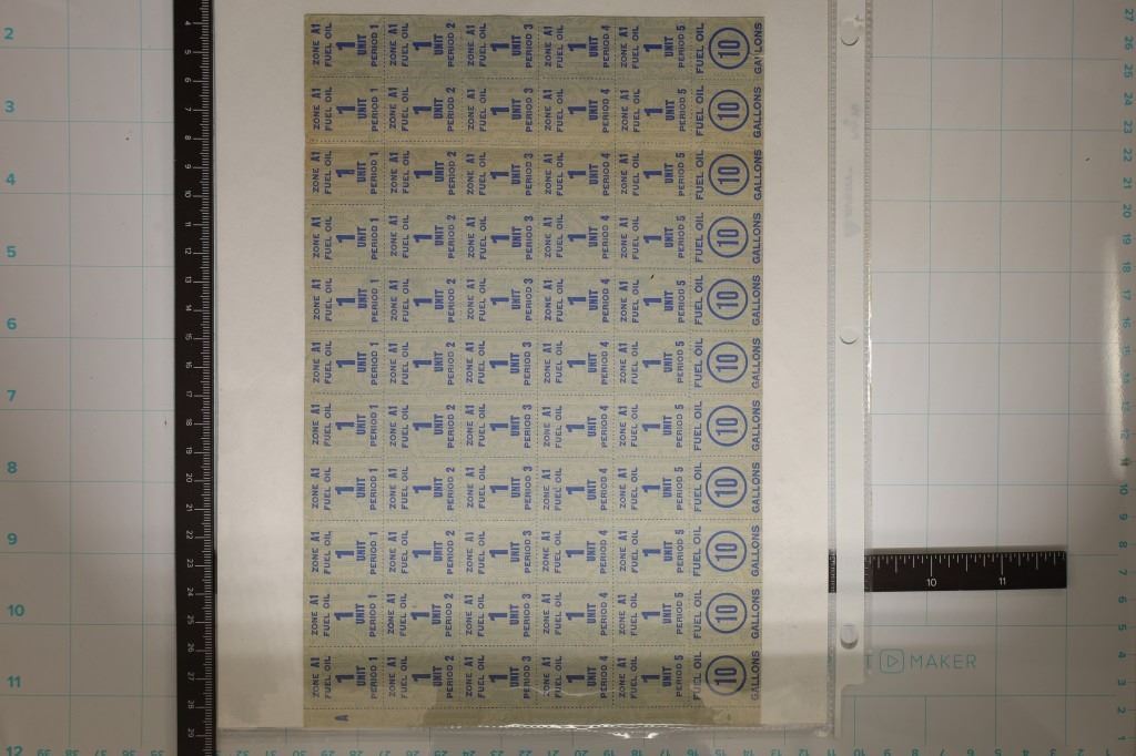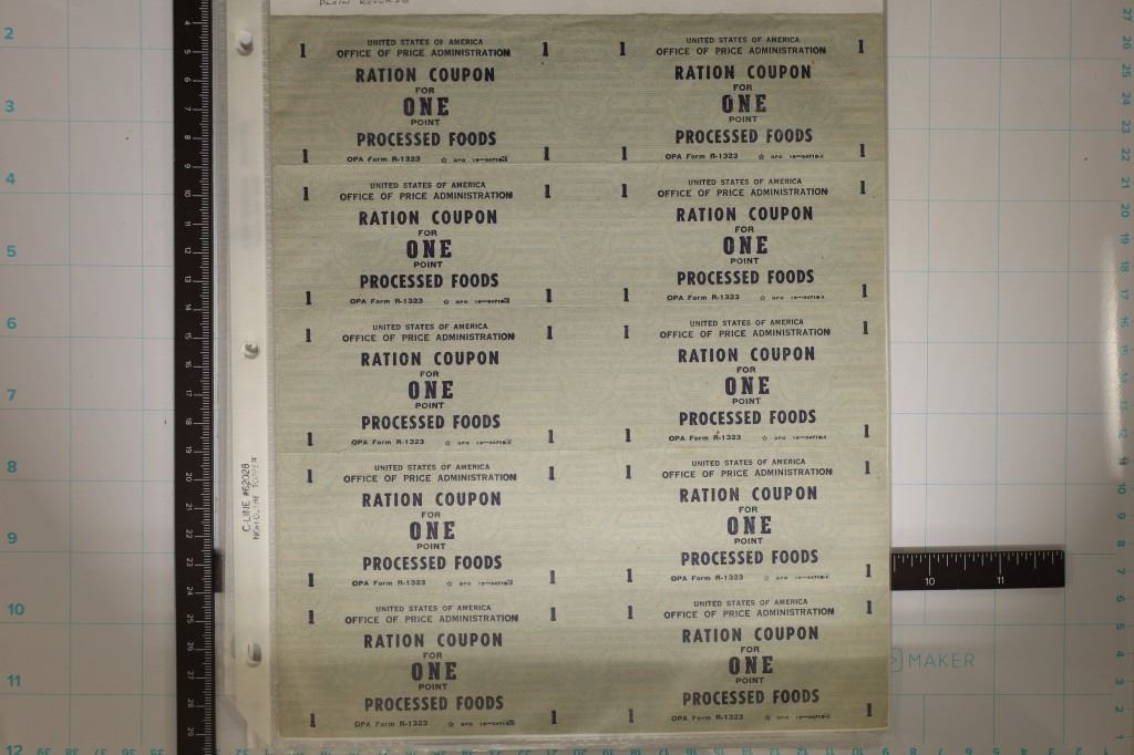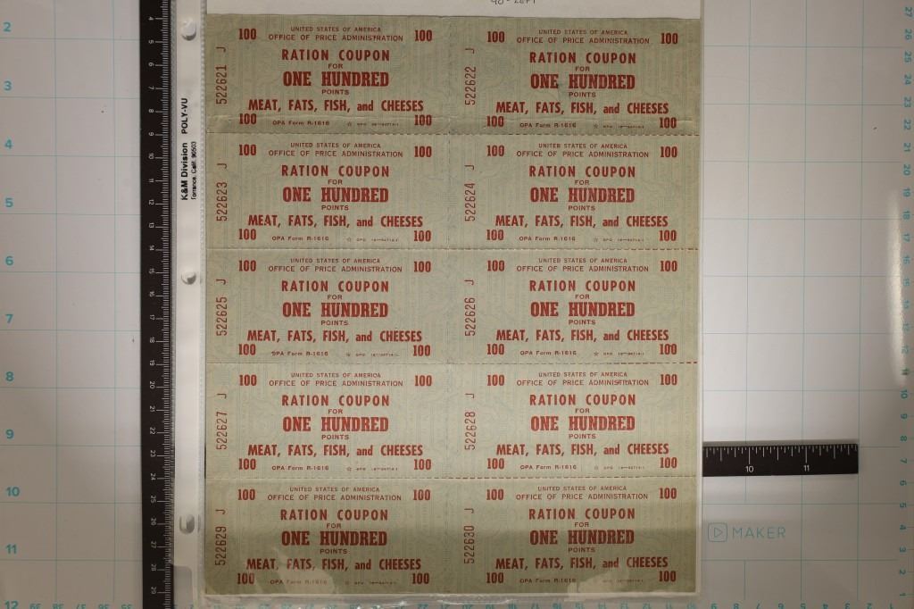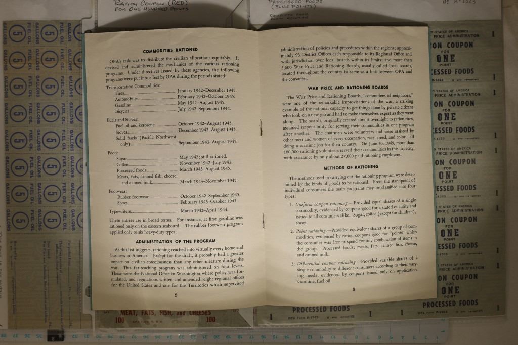 RATIONING AND WWII PAMPHLET INCLUDES: 10 ONE POINT FOR PROCESSED FOODS, 10 ONE HUNDRED POINTS FOR MEATS, FATS, FISH & CHEESES AND 48 FUEL 1 & 5 GALLON UNUSED COUPONS, ALL ARE UNC