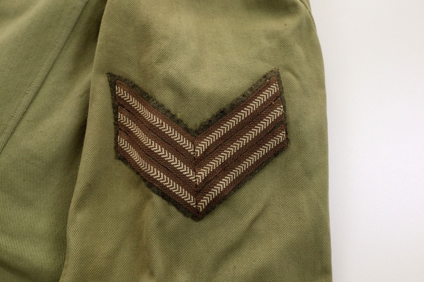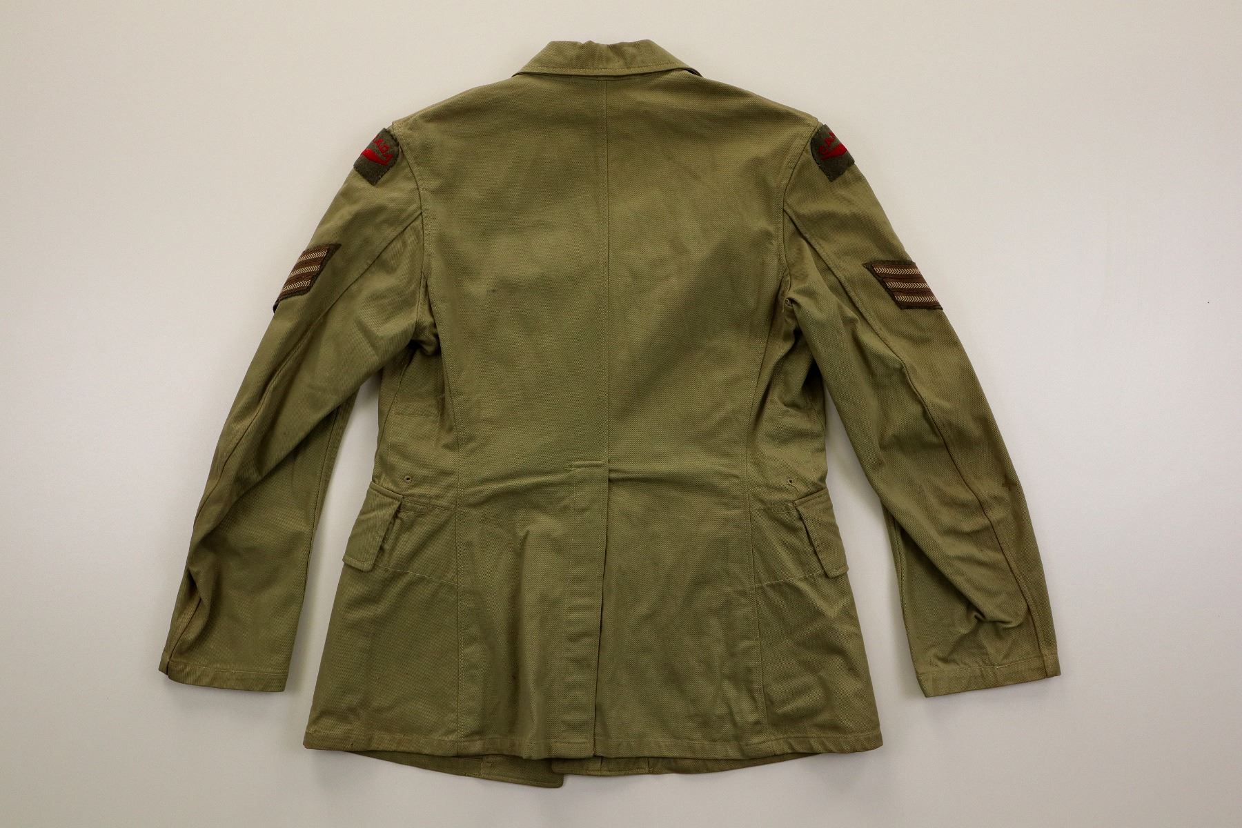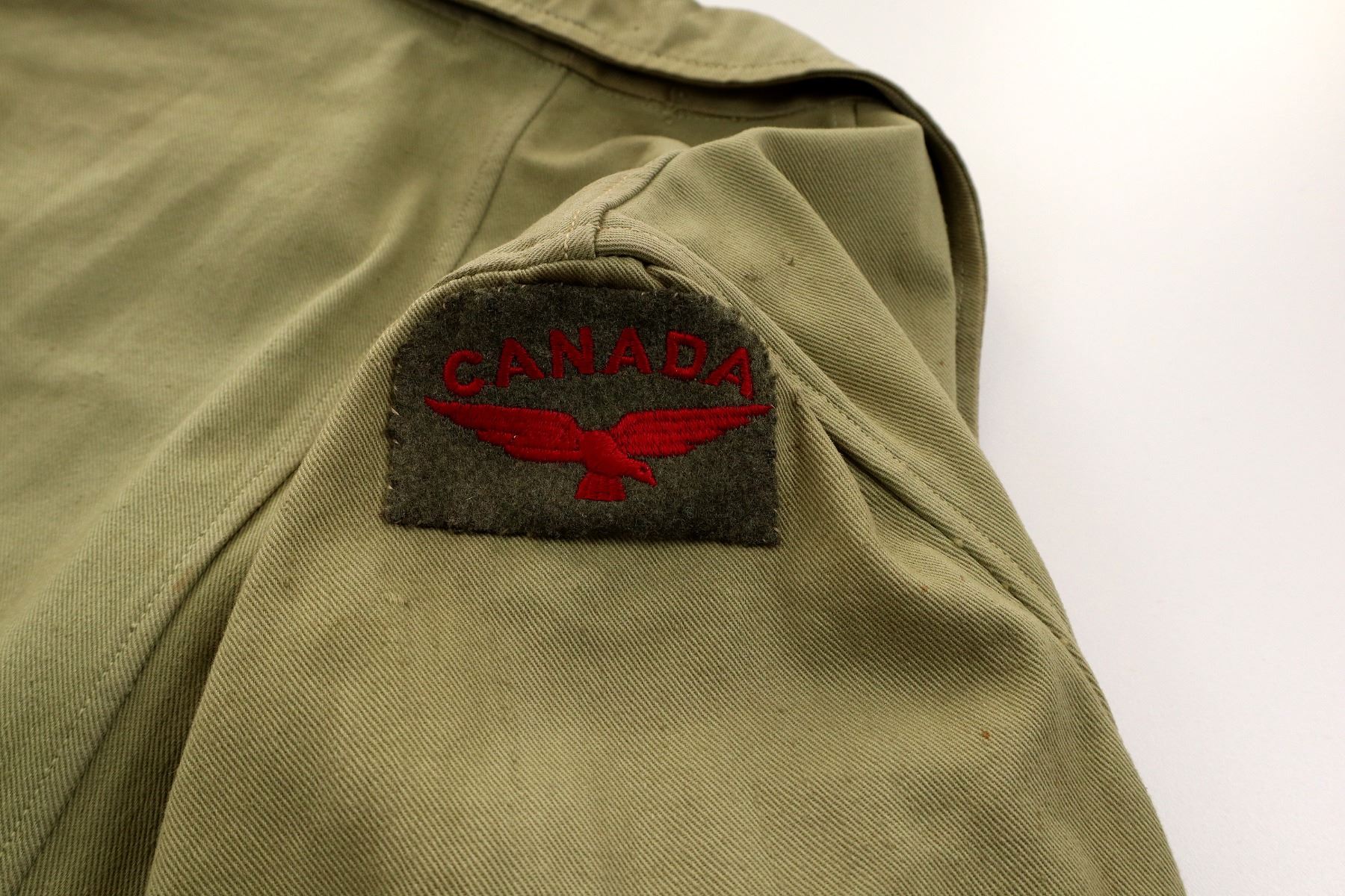 (1) KHAKI CANVAS TUNIC, MARKED: "1942, ASCOT CLOTHES LIMITED, SIZE 12, 5FT 5-8", 35-39" WITH C-BROAD ARROW, CANADA WITH EAGLE BADGES, SERGEANT RANK CHEVRONS, BUTTON FRONT, MISSING ALL BUTTONS, SHOULDER WIDTH APPROX. 16.5". SEE PHOTOS.