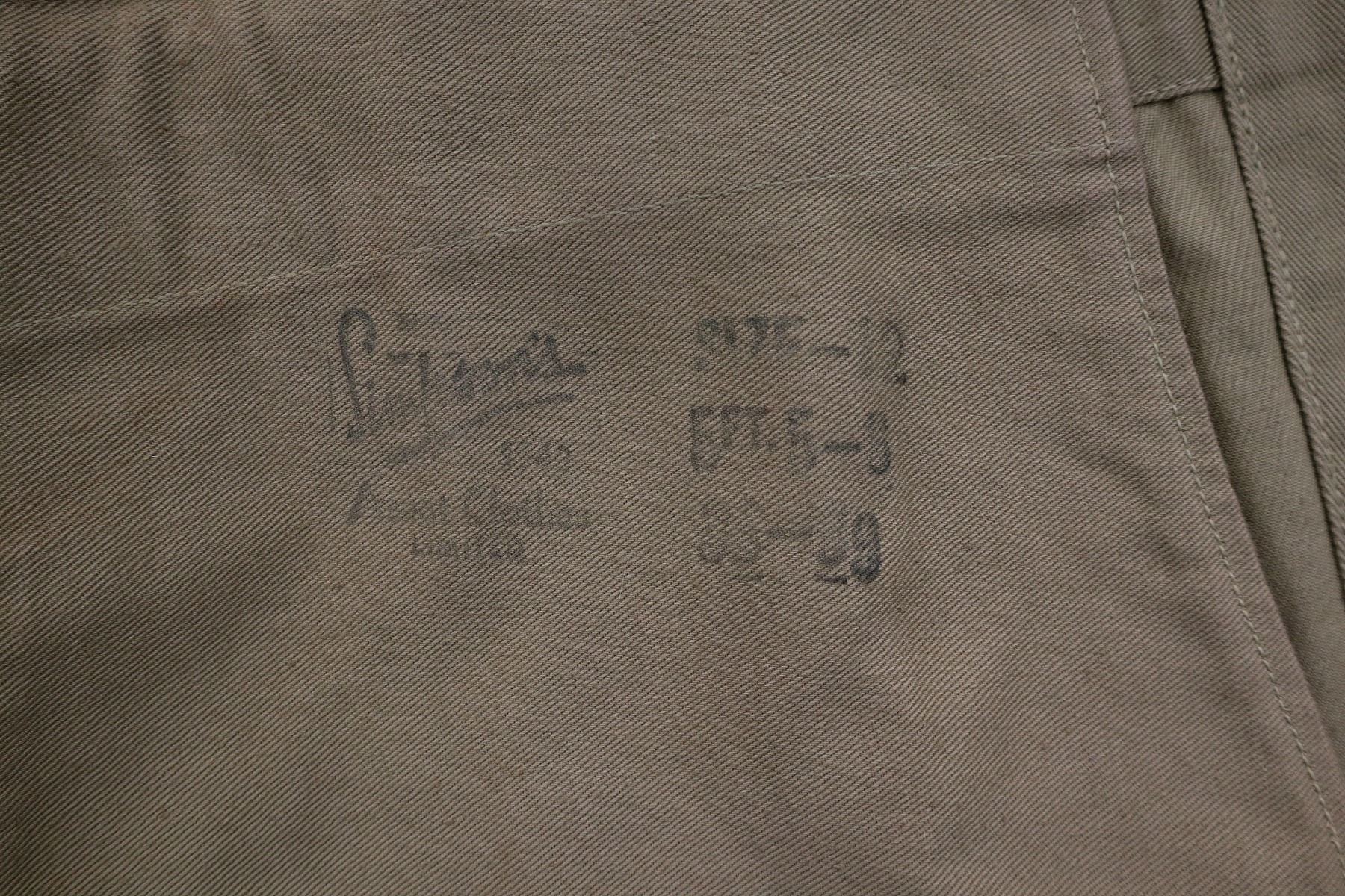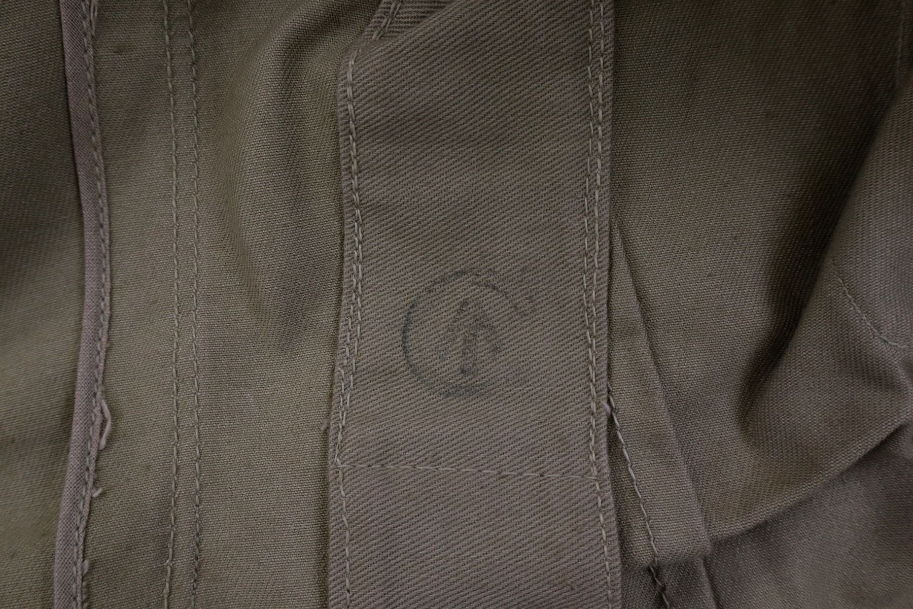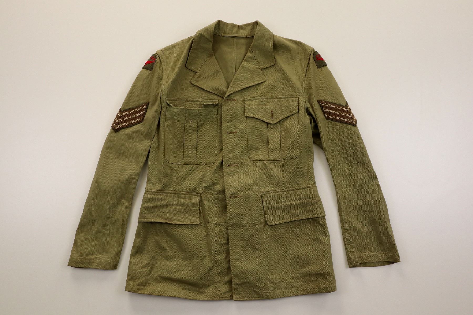 (1) KHAKI CANVAS TUNIC, MARKED: "1942, ASCOT CLOTHES LIMITED, SIZE 12, 5FT 5-8", 35-39" WITH C-BROAD ARROW, CANADA WITH EAGLE BADGES, SERGEANT RANK CHEVRONS, BUTTON FRONT, MISSING ALL BUTTONS, SHOULDER WIDTH APPROX. 16.5". SEE PHOTOS.