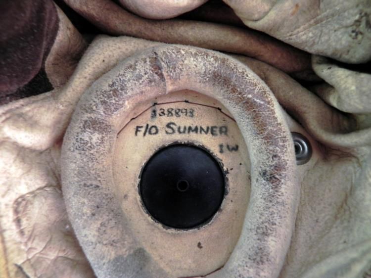 WWII RCAF/ROYAL CANADIAN AF FLYING HELMET TYPE C--EARPHONES MARKED-AM-10A/13466---BROWN LEATHER EXTERIOR--INTERIOR IS CHAMOIS SOFT LEATHER AND MARKED FAINTLY "NO 3 AND MAKER"--INSIDE EARPHONES MARKED WITH SOLDIER'S NAME AND SERIAL #--PARTIAL ELECTRICAL PLANE CORD IN BACK-SOME FIELD REPAIR TO 1 EARPHONE