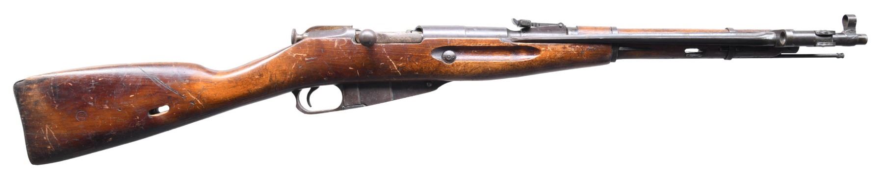 CARBINE. Cal. 7.62x54R. S# BA6873. Matching numbers on bbl. & bolt. Bbl. 20 1/4". Tangent rear sight graduated to 1,000 meters. Post front sight w/ protective hood. Bbl. is marked over chamber w/ Izhevsk hammer & sickle over wreath. Also marked "1945" & "arrow in triangle". Straight bolt handle. Cleaning rod is present. 12 1/4" folding quadrangular spike bayonet. Hardwood stock set. Buttstock has two piece construction at toe. Marked on right side of buttstock w/ encircled "10" indicating weapon used by Bulgaria. Front sling slot has metal liner. CONDITION: stock has well-worn arsenal rework finish w/ numerous scratches & handling marks. Metal has turned largely gray & patina w/ traces of original blue. Bore shows oxidation & light pitting throughout. (25-593/RW). CURIO. $300-400.