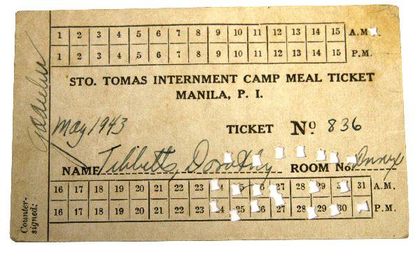 A rare original Santo Tomas Internment camp, Manila, Philippines from May 1943 belonging to Dorothy Tibbetts, ticket # 836. Sto. Tomas was a notorious Internment camp which many Americans were held captive by the Japanese in WWII.