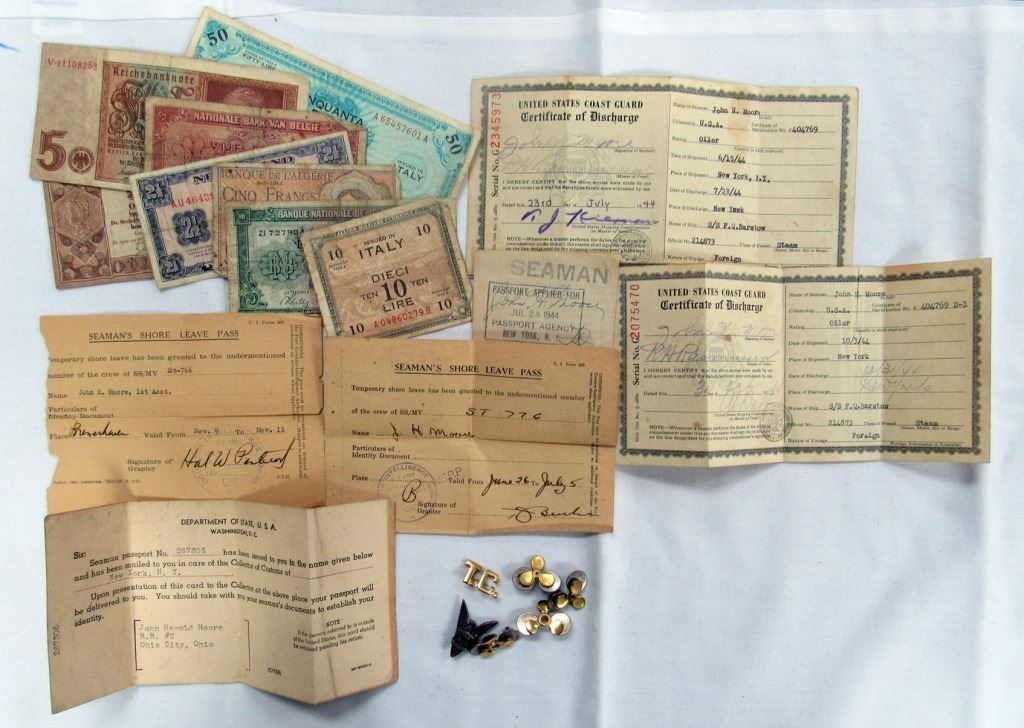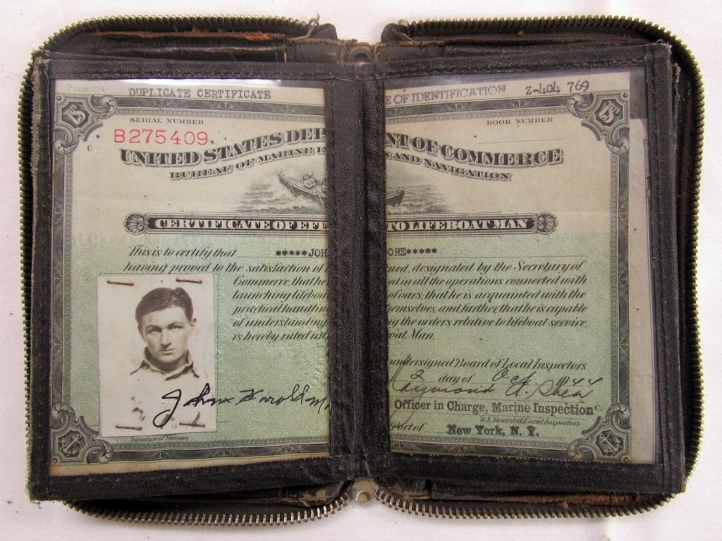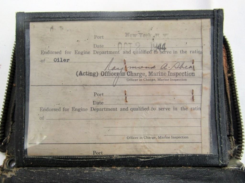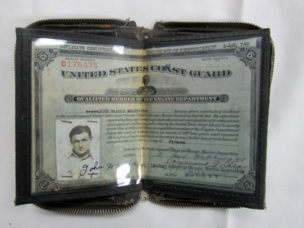 ISSUED BY US DEPARTMENT OF COMMERCE. PAPER FOR JOHN HERALD MOORE OF OHIO CITY, OHIO. HE WAS A FIREMAN IN THE ENGINE DEPT. QUALIFIED MEMBER OF THE ENGINE DEPT CERTIFICATION. CERT AS A LIFEBOAT MAN. SOME PROPELLER PINS, AND