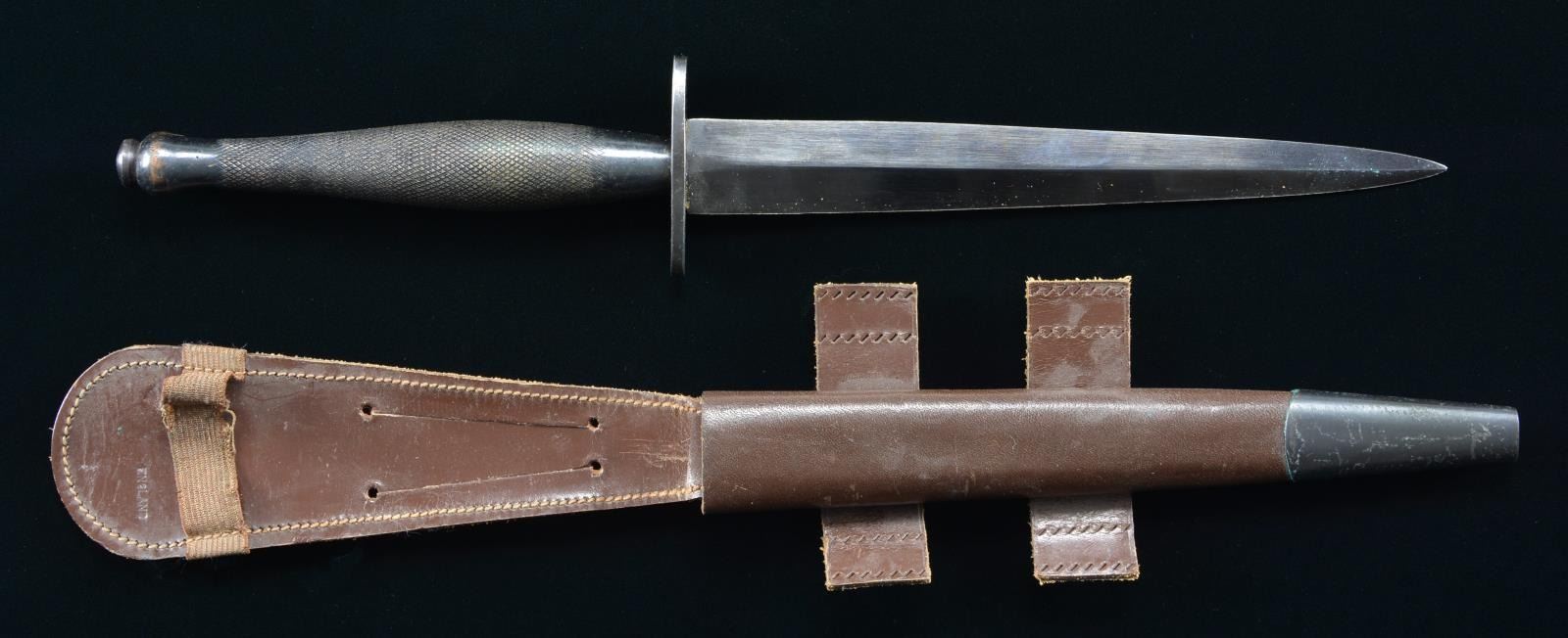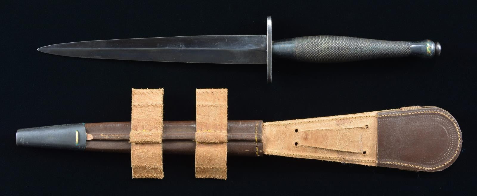 FIGHTING KNIFE.Overall length 11 3/4". Blade length 6 3/4". Blued spear point blade with raised medial ridge. Blued hand guard with black painted knurled brass grip. Underside of guard is stamped "ENGLAND" over a broad arrow "B2" stamp. Brown leather scabbard stamped "ENGLAND" with blued drag. CONDITION: blade retains the vast majority of its original factory blued finish. Grip shows some thinning through to brass, but is otherwise good. Scabbard shows some creasing and minor wear, with some oxidation on the drag, but otherwise remains sturdy and serviceable. PROVENANCE: From the Lifelong Collection of Glen E. Mattox. (02-18455/MLW). $300-400.