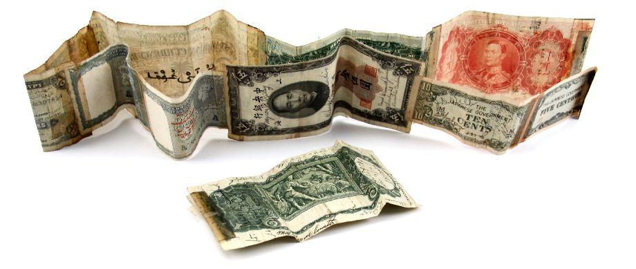 WWII short snorter with many legible signed names and locations, including Guadalcanal, dated Oct 1, 1944 . Among the other noted on the chain are British Guiana dollar, Brazilian milreis, West African Shilling, Egyptial piastrie, Indian rupee, Australian pounds, Chinese gold note, and Japanese occupation currency from Philippines. Many signatures, several with rank, including Lieutenant, Major, and Captain. 10 notes in all. Condition is very good, with typical age, and one note separated from chain.
