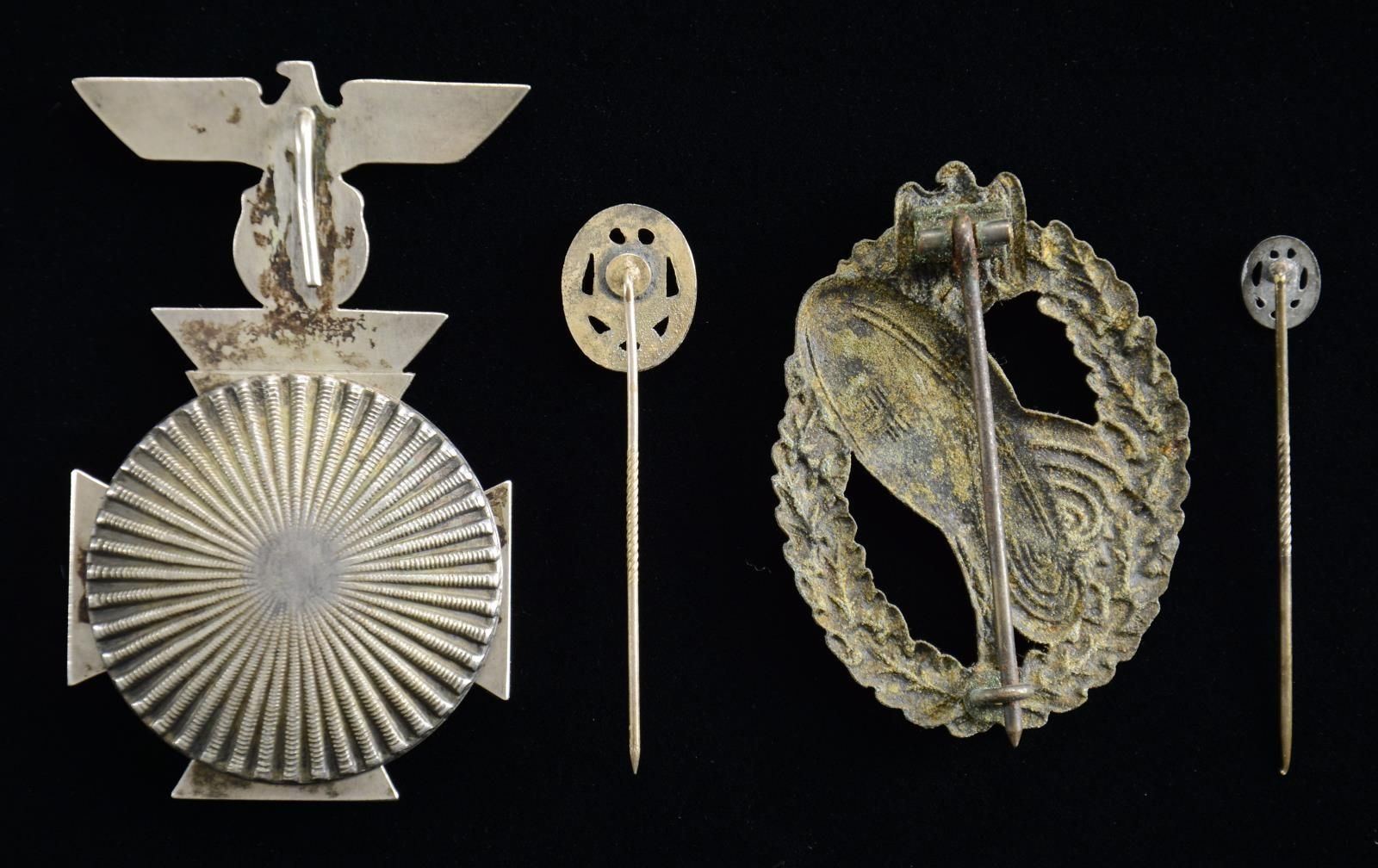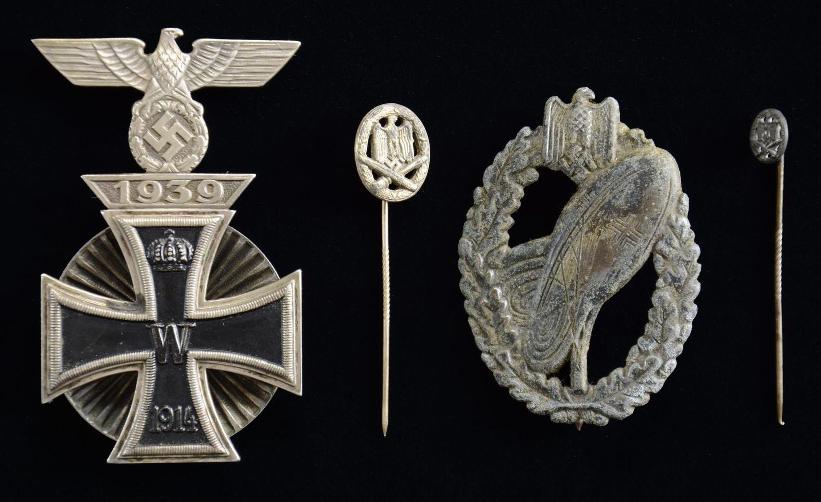 2 STICKPINS, & A WWI 1st CLASS IRON CROSS WITH SPANGE. This lot contains items of questionable authenticity that may be of post-WWII manufacture. We encourage interested parties to examine items in this lot closely and in person, if possible. Preview times are available upon request. 1) BALLOON. A seldom-seen WWII German Balloon Observer’s Badge. This stamped badge features an oak leaf wreath with a Wehrmacht eagle at the top and a central Observer’s balloon. The badge appears to have, at one time, had a silvered finish. The reverse has a narrowed pin. (02-22528/BF). 2,3) STICKPINS. Two small stickpins featuring a General Assault Badge. Pins have knurling in the center. (02-22528/BF). 4) IRON CROSS. A WWI 1st Class Iron Cross with a non-magnetic center and an integral Spange attached to the top. The reverse has a screw-on rayed circular device for attachment, and the Spange has a small pocket clip attached. (02-22536/BF). CONDITION: the Balloon Badge has an oxidized finish, both on the front and the reverse. Stickpins show light wear. Iron Cross also shows light wear with some tarnish to the silver. NON-GUN. $100-300.