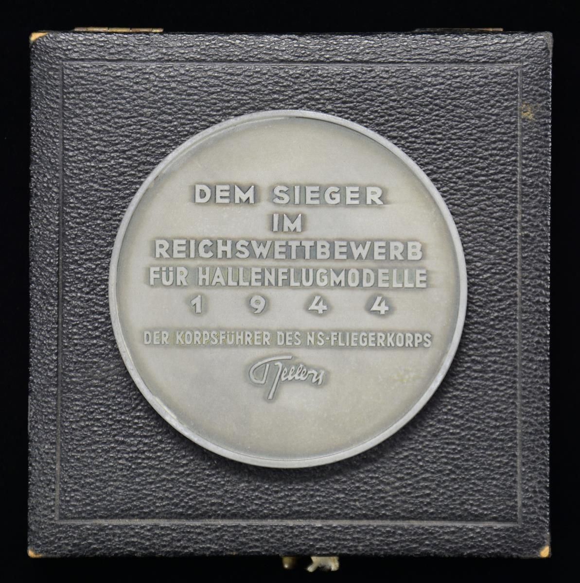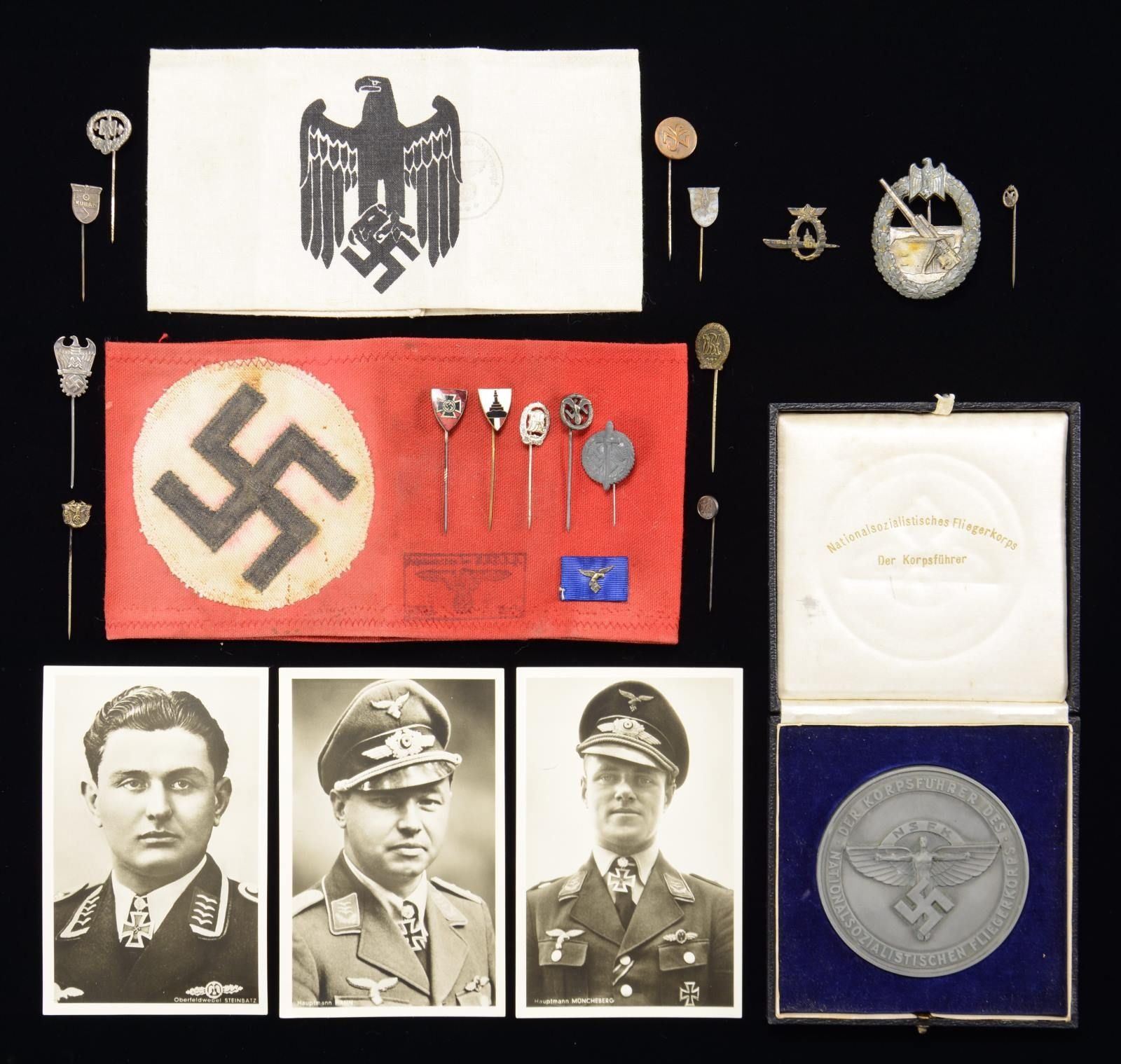 AWARDS, & MORE. This lot contains items of questionable authenticity that may be of post-WWII manufacture. We encourage interested parties to examine items in this lot closely and in person, if possible. Preview times are available upon request. 1) STICKPINS. Lot of 13 WWII-style German stickpins that include, but are not limited to, the Krim shield, DRL Sports Badge, Sudetenland Medal, Todt, Kuban, Veteran’s, Heavy Sports, and more. This lot also includes a Luftwaffe Long Service ribbon bar with no pin. (02-22566/BF). 2) ARMBANDS. One homemade party armband and one Wehrmacht eagle armband. (02-22566/BF). 3) POSTCARDS. Three photographic postcards of Luftwaffe Knight’s Cross winners. (02-22566/BF). 4) DESK MEDAL. A fine example of an NSFK Desk Medal award measuring 3 1/4" in diameter with an NSFK insignia on the front and the words "DER KORPSFUHRER DES NATIONALSOZIALISTISCHEN FLIEGERKORPS". The reverse reads "DEM SIEGER IM REICHSWETTBEWERB FUR HALLENFLUGMODELLE 1944 DERKORPSFUHRER DES NS-FLIEGERKORPS". The medal is in its original case of issue with a blue velvet base and gold-embossed off-white pillow. (02-22568/BF). 5) COAST ARTILLERY. A scarce example of a WWII-style German Coast Artillery War Badge. Badge has an outer oak leaf wreath with an eagle and party symbol at the top. The center of the badge depicts a Coast Artillery cannon. The reverse has a narrow pin and is marked "F L L" in circles. (02-22593/BF). 6) STICKPINS. This group includes one Coast Artillery War Badge stickpin and one Naval Dock Yard Worker’s Achievement Badge stickpin, with the pin detached but present. (02-22593/BF). CONDITION: all items generally show light wear and are complete. NON-GUN. $75-125.