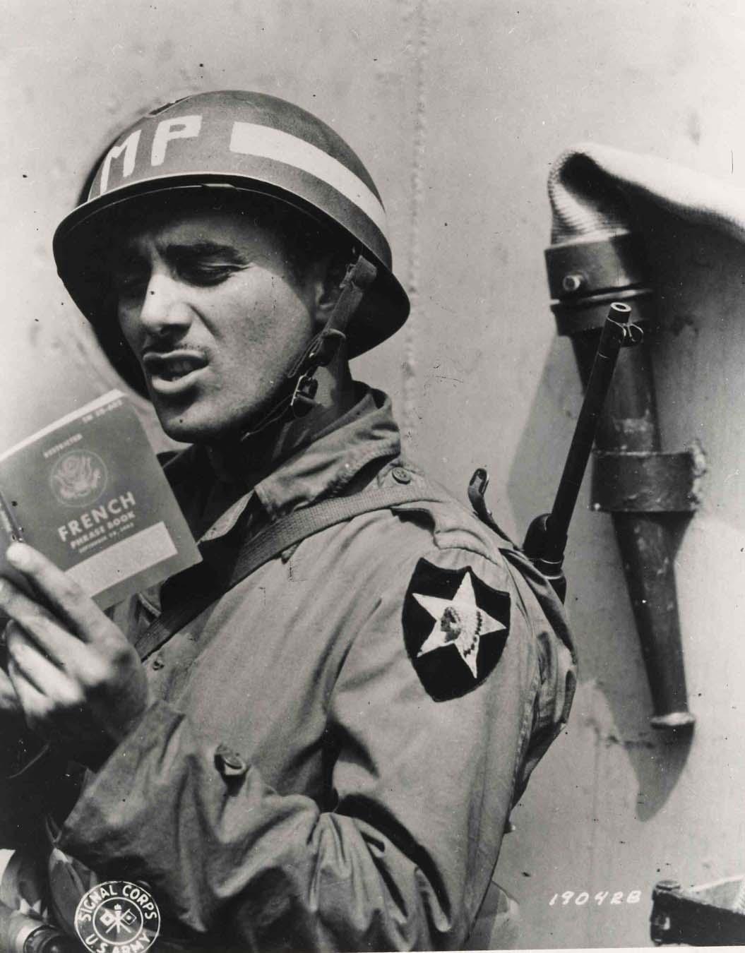 Original World War II press photo dated 15 June 1944 shows an American soldier reading a French phrase book. Information sheet glued to photo stamped by the War Department's Bureau of Public Relations states that Officer Reece Fests is brushing up on his French as he awaits a transfer to a Normandy beachhead. 8'' x 10'' glossy black and white photo has staining to verso, light creasing and scratching, otherwise very good.
