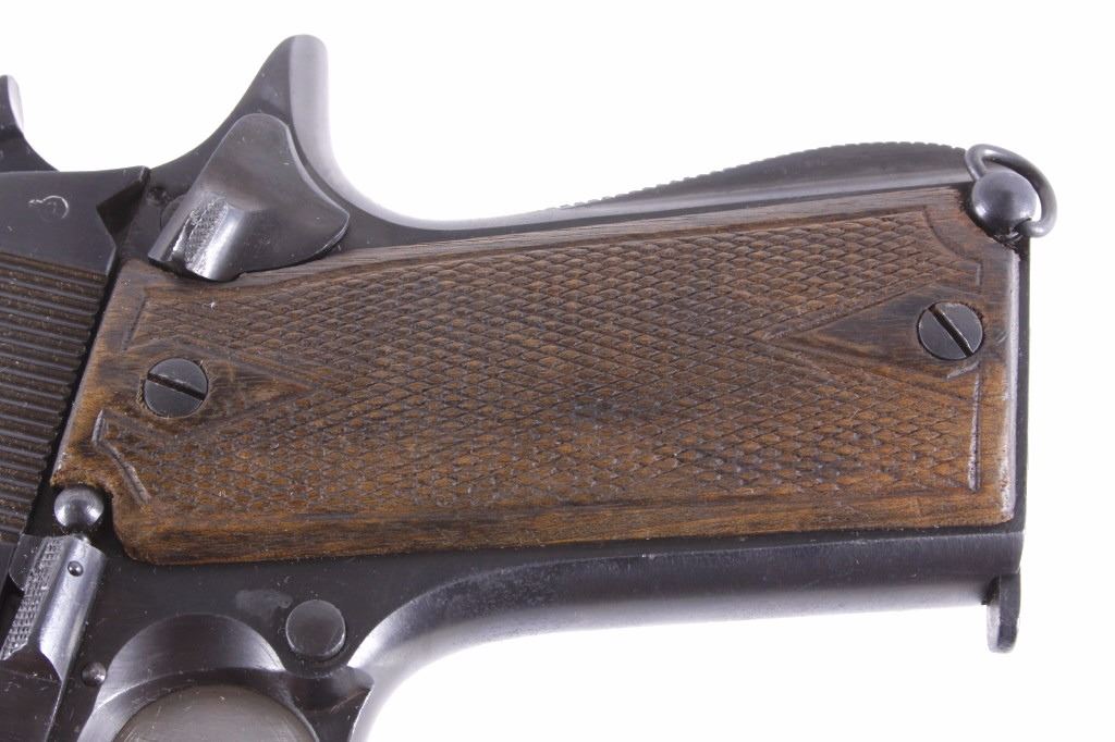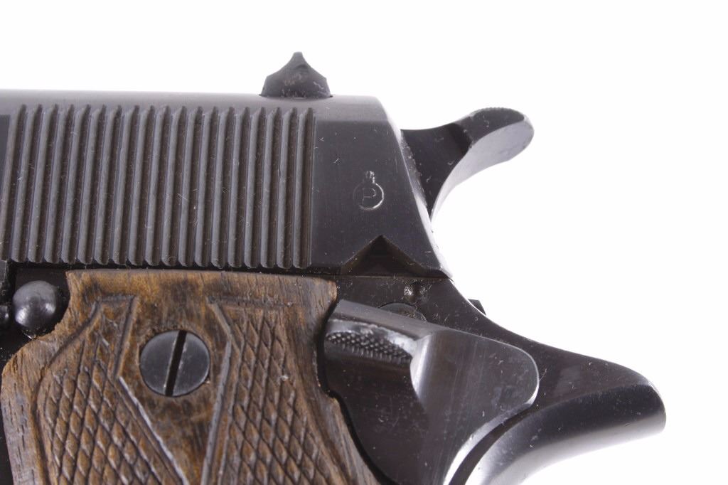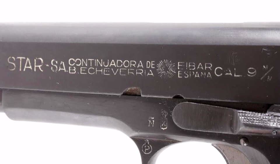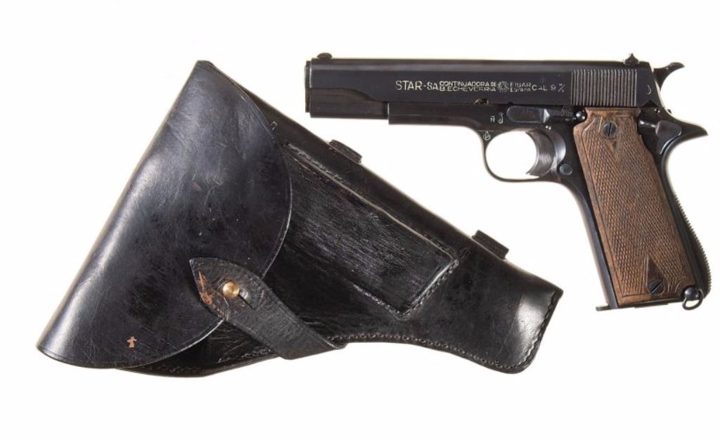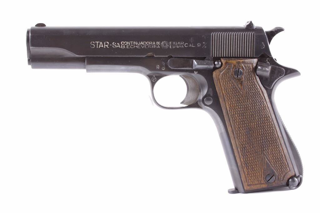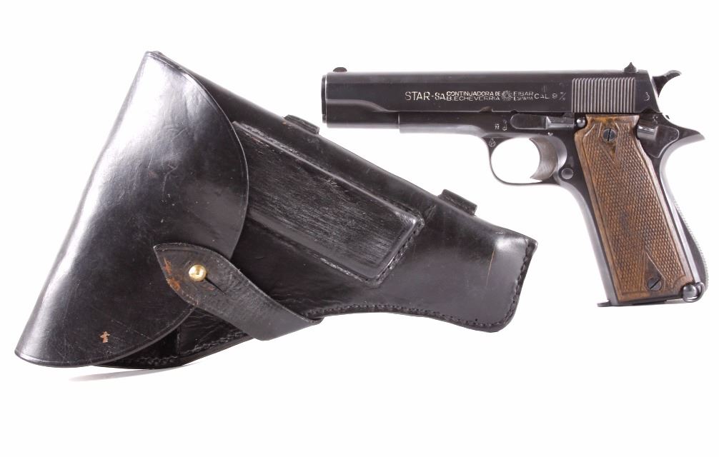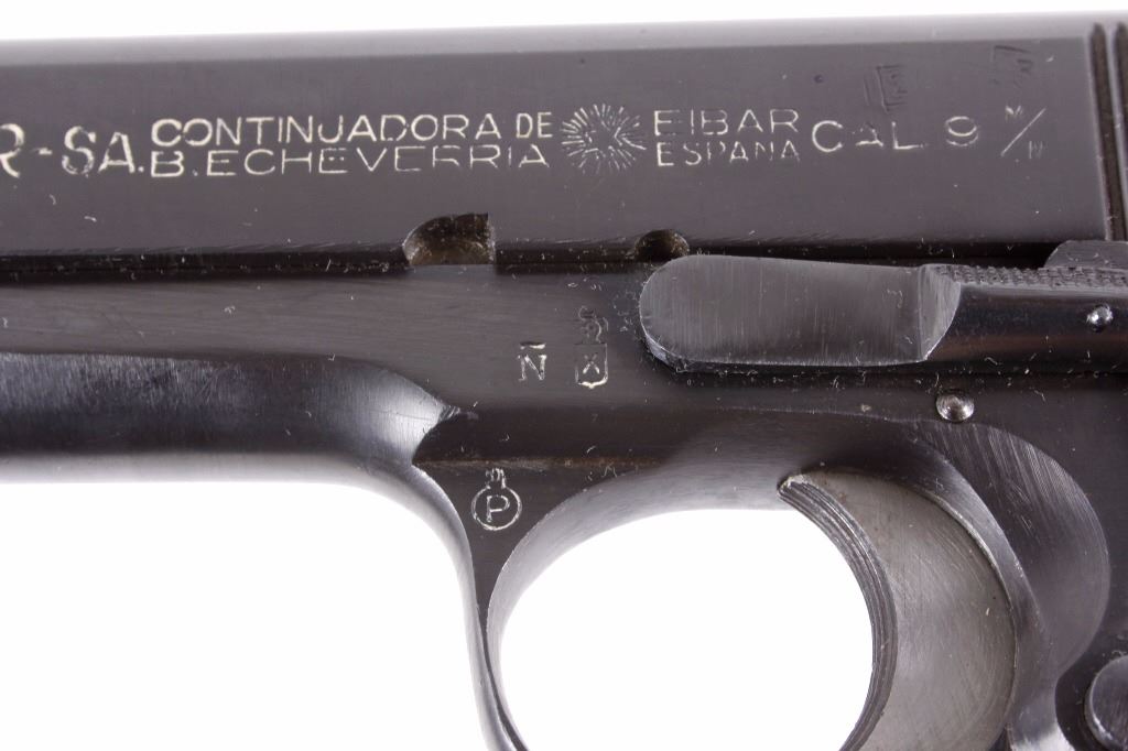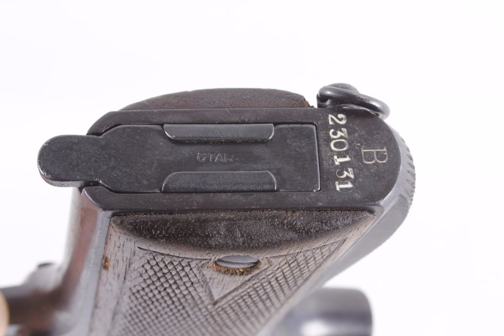 This is an excellent rare Star-Bonifacio Echeverria SA Model B WWII 9mm pistol. The handgun shows a Colt 1911 style design and shows much if not all of the original blue finish (90% plus) and has walnut checkered grips. This WWII rare pistol shows the Nazi acceptance mark on the right side of the frame, "eagle/WaA251." This WWII issue pistol was manufactured in 1943 and comes with the original unmarked black leather holster with "STAR" marked "131" matching serial number magazine and extra "STAR 338" magazine (two mags total). With only 13,000 of these variants being made and a limited amount being Nazi proof marked, this is truly a very rare piece. Marked on left, "STAR-SA CONTINJADORA DE B. ECHEVERRIA EIBAR ESPANA CAL 9 M/M" with bomb 'P' and other correct markings. Marked on right with correct hallmarks and the Nazi German eagle/WaA251. Serial Number 230131. Curio & Relic requires FFL Transfer or NICS Background. Review the pictures for description correctness and originality. Some have claimed this firearm to be a Bulgarian Ministry with spurious Nazi mark. Review pictures for originality and correctness.