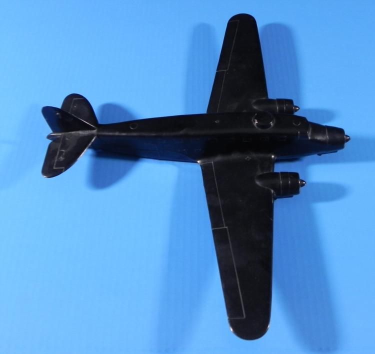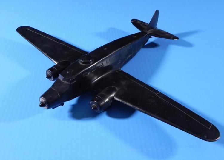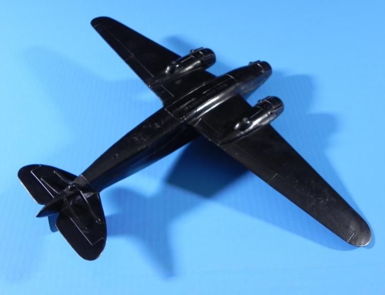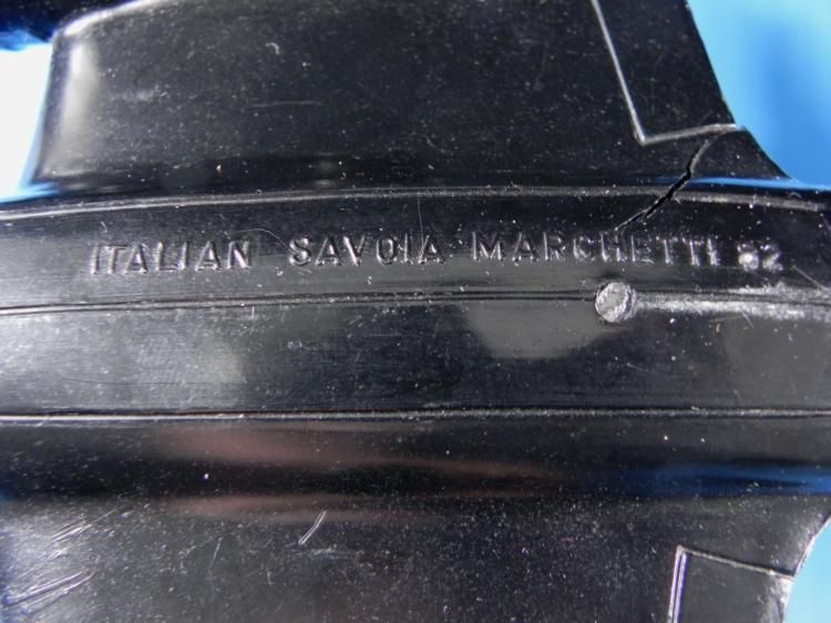 This airplane is a "spotter," made to teach and aid in aircraft identification during WW II. It is a little larger than usual, measuring 12" in length, with a 16" wingspan. It is all plastic in matte black. The model of the plane is marked underneath the fuselage: Italian Savola Marchetti 82. It is in very good condition overall. * * * This is a terrific piece of U.S. WW II memorabilia.