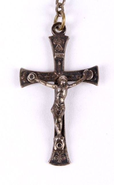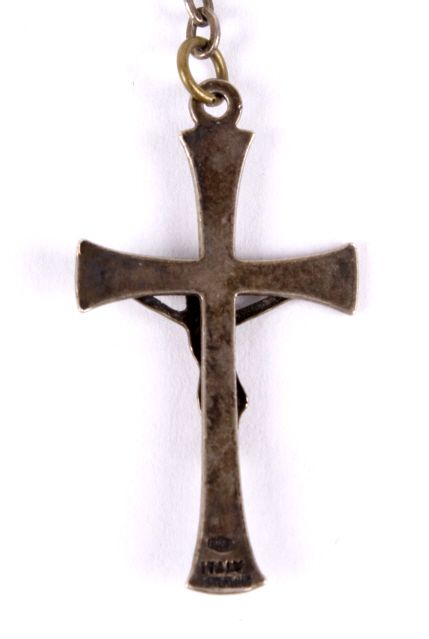This lot features a sterling silver Soldier's Cross. This WWII item was likely carried by a U.S. soldier during the war as an extra layer of protection. It measures .75" x 1.25" and is 14" long.