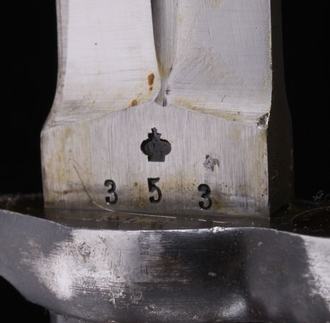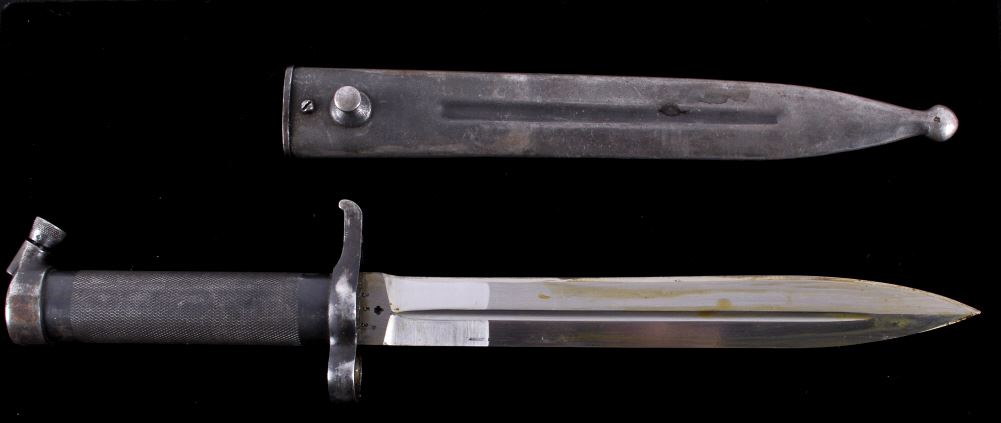 This is a World War II Swedish Mauser Model  M1896 Bayonet with the scabbard. The piece  was never issued and still has the packing  oil on the blade and scabbard. Rare bayonet  is 14"l overall with a 8.25" blade.