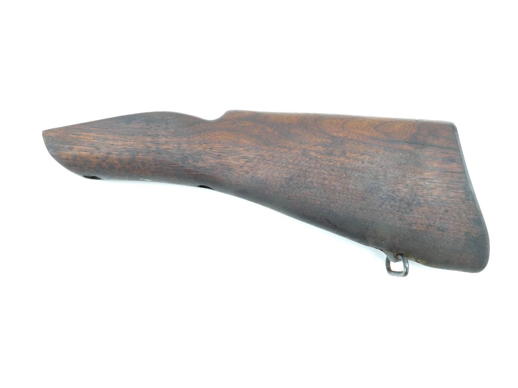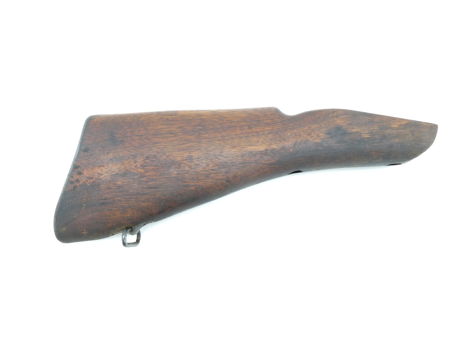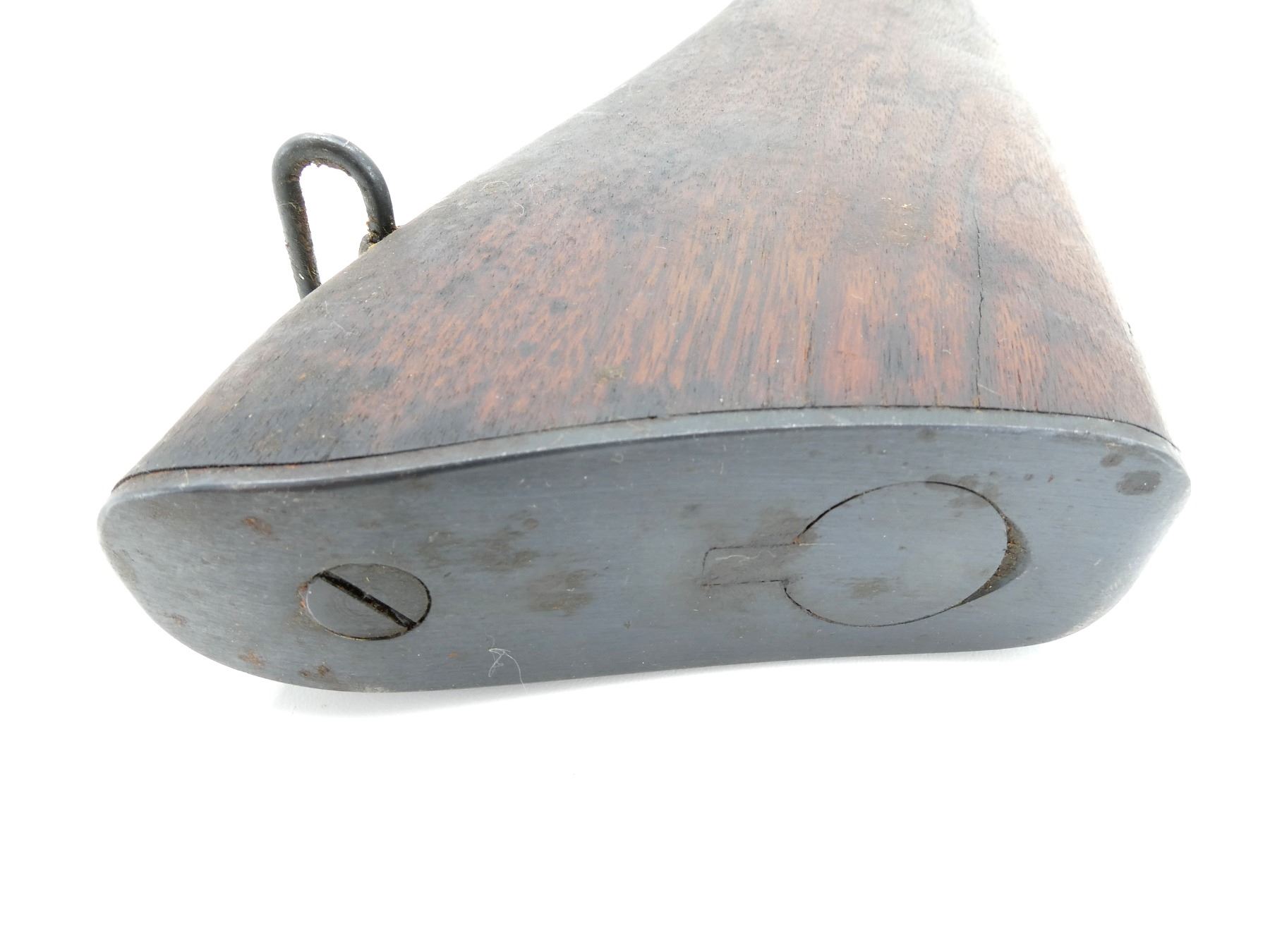 (1) WOOD BUTT STOCK WITH METAL FITTINGS, BOTTOM SLING SWIVEL, UNMARKED, METAL BUTT PLATE, OAL APPROX. 13.5". MAY REQUIRE FITTING. SEE PHOTOS.