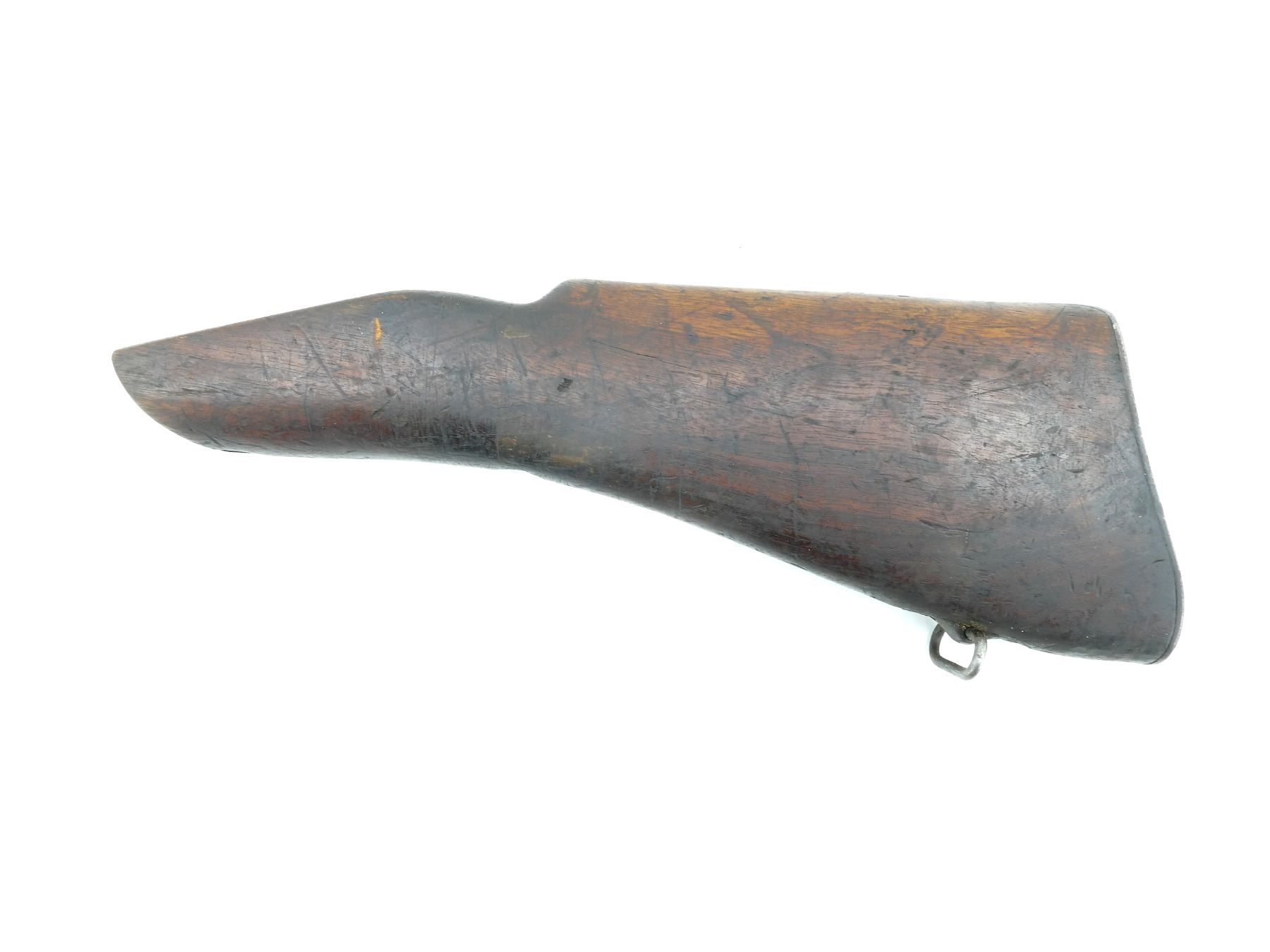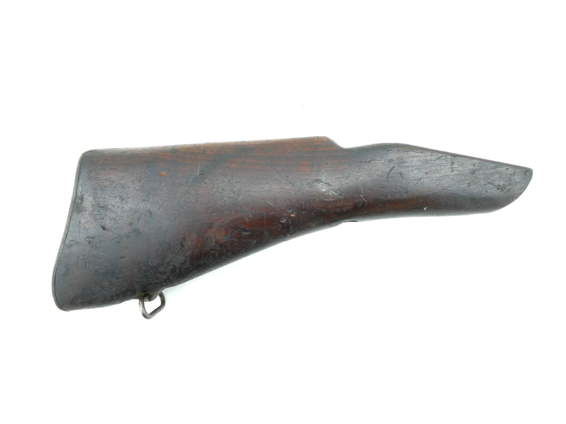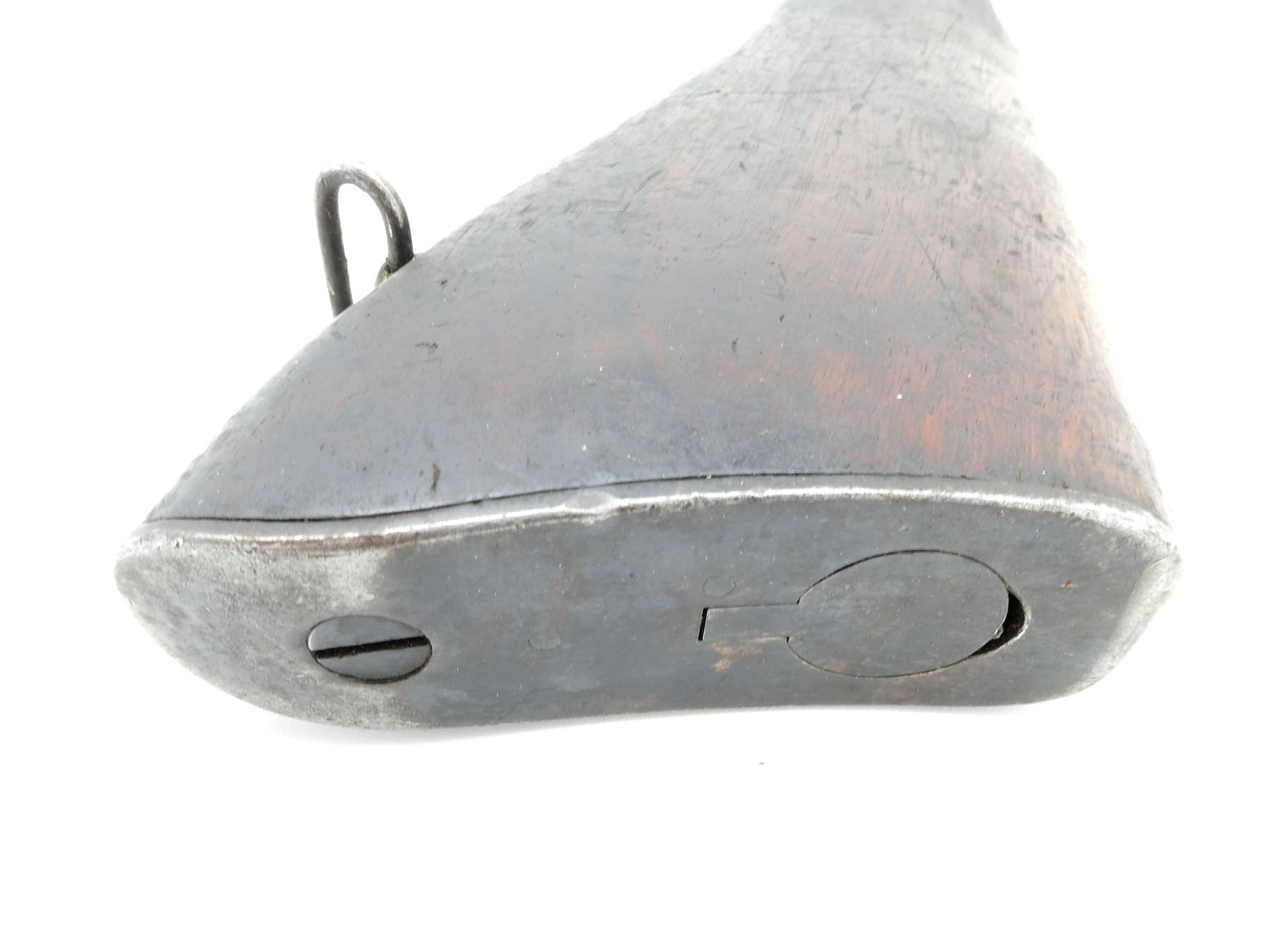 (1) WOOD BUTT STOCK WITH METAL FITTINGS, BOTTOM SLING SWIVEL, UNMARKED, METAL BUTT PLATE, OAL APPROX. 13.5". MAY REQUIRE FITTING. SEE PHOTOS.